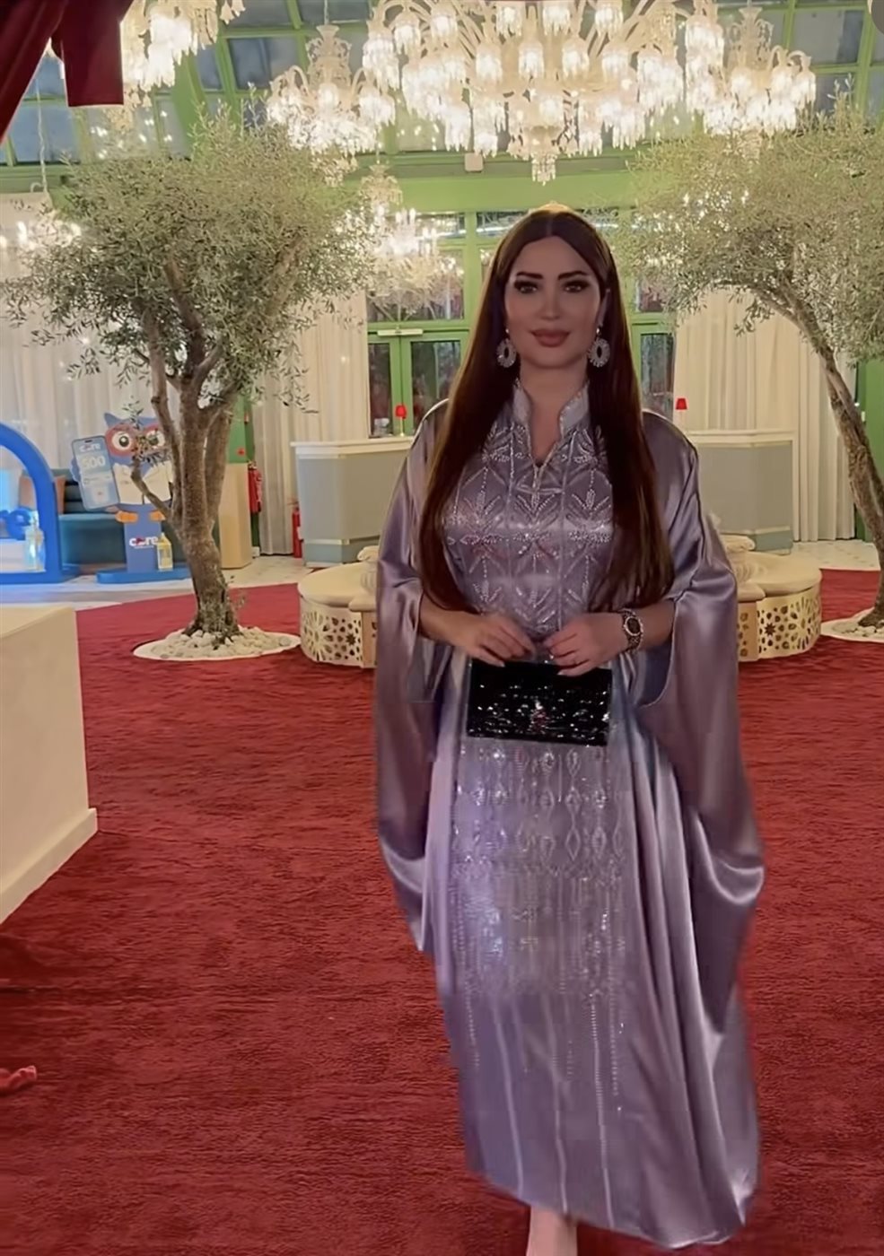وقد اختارت نسرين طافش إطلالة مستوحاة من الأزياء الشرقية بلمسة عصرية، حيث ارتدت قفطانًا فضيًا أنيقًا بتصميم انسيابي يعكس البساطة المترفة. وتميز القفطان بقصّة فضفاضة مريحة مع أكمام واسعة تضفي على الإطلالة لمسة درامية ناعمة، فيما برزت التطريزات اللامعة التي زيّنت الجزء الأمامي من التصميم على شكل نقوش هندسية دقيقة أضفت بريقًا راقيًا على اللوك بالكامل.