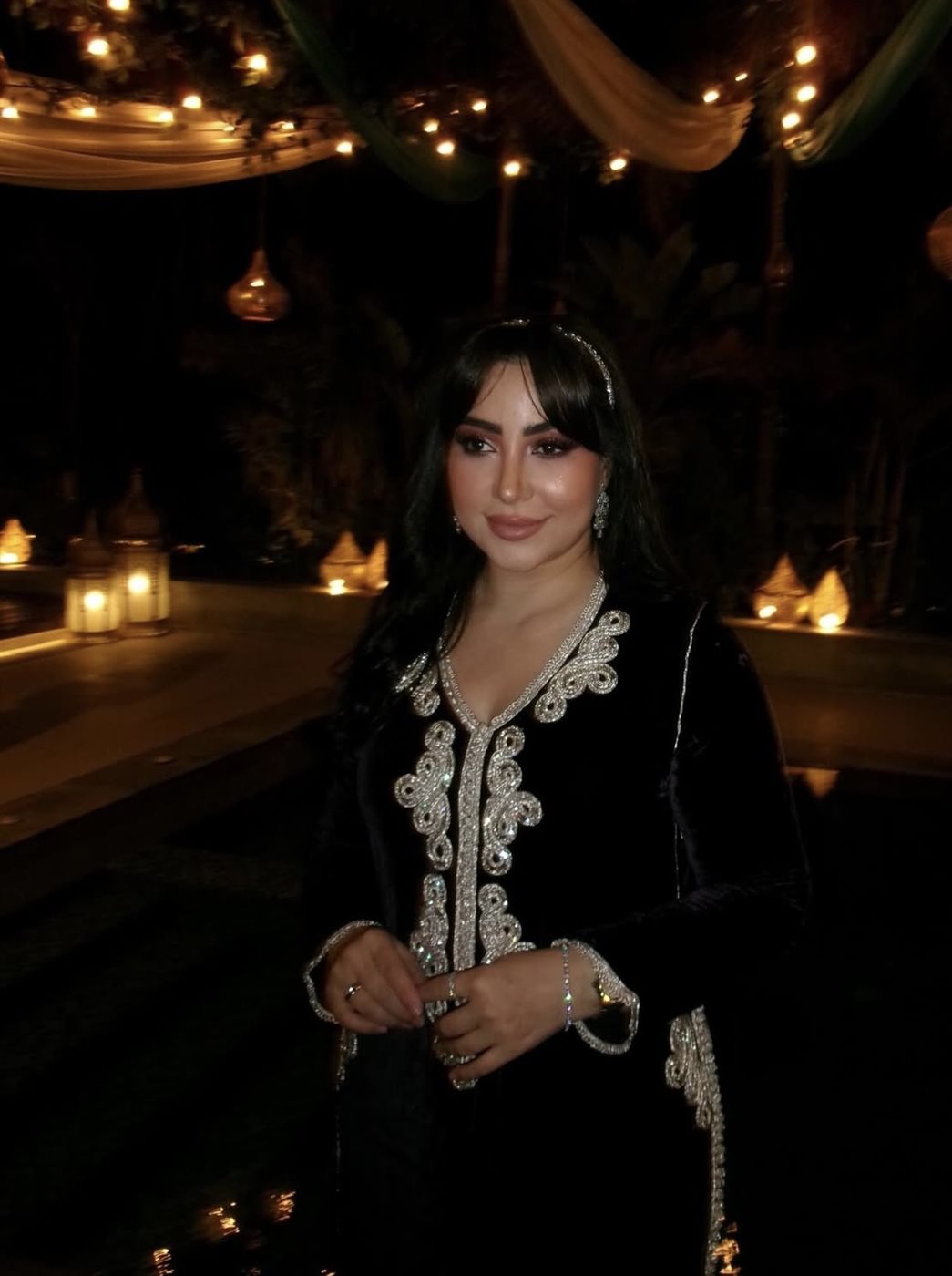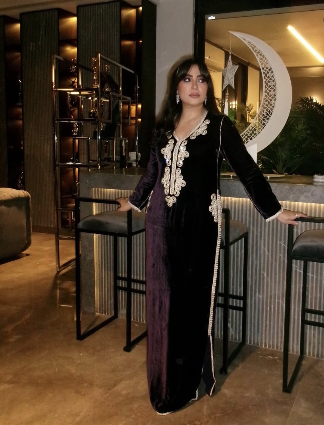 أما من حيث الأجواء، فقد عكست الصور أجواءً رمضانية ساحرة، حيث ظهرت بوسي وسط ديكور دافئ تزيّنه الإضاءات الخافتة والفوانيس، إلى جانب عناصر زخرفية مثل الهلال، ما عزز الطابع الاحتفالي والروح الشرقية التي تنسجم مع تفاصيل إطلالتها. هذا التناغم بين الإطلالة والمكان أضفى على الصور طابعًا بصريًا جذابًا، جعلها أقرب إلى لوحة فنية متكاملة.