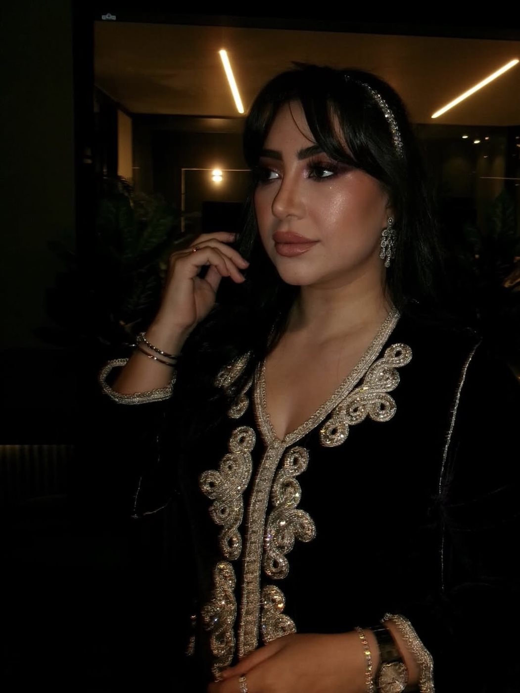 وقد ظهرت بوسي بفستان طويل من المخمل الأسود، تميّز بتصميمه الكلاسيكي الذي يعكس روح الأناقة الشرقية، حيث زُيّن بتطريزات ذهبية فاخرة امتدت على منطقة الصدر والأكمام، ما أضفى على الإطلالة لمسة من الرقي والفخامة. هذا التناغم بين اللون الأسود العميق والتفاصيل الذهبية منحها حضورًا قويًا ومميزًا، خاصة مع بساطة القصّة التي أبرزت جمال التصميم دون مبالغة.