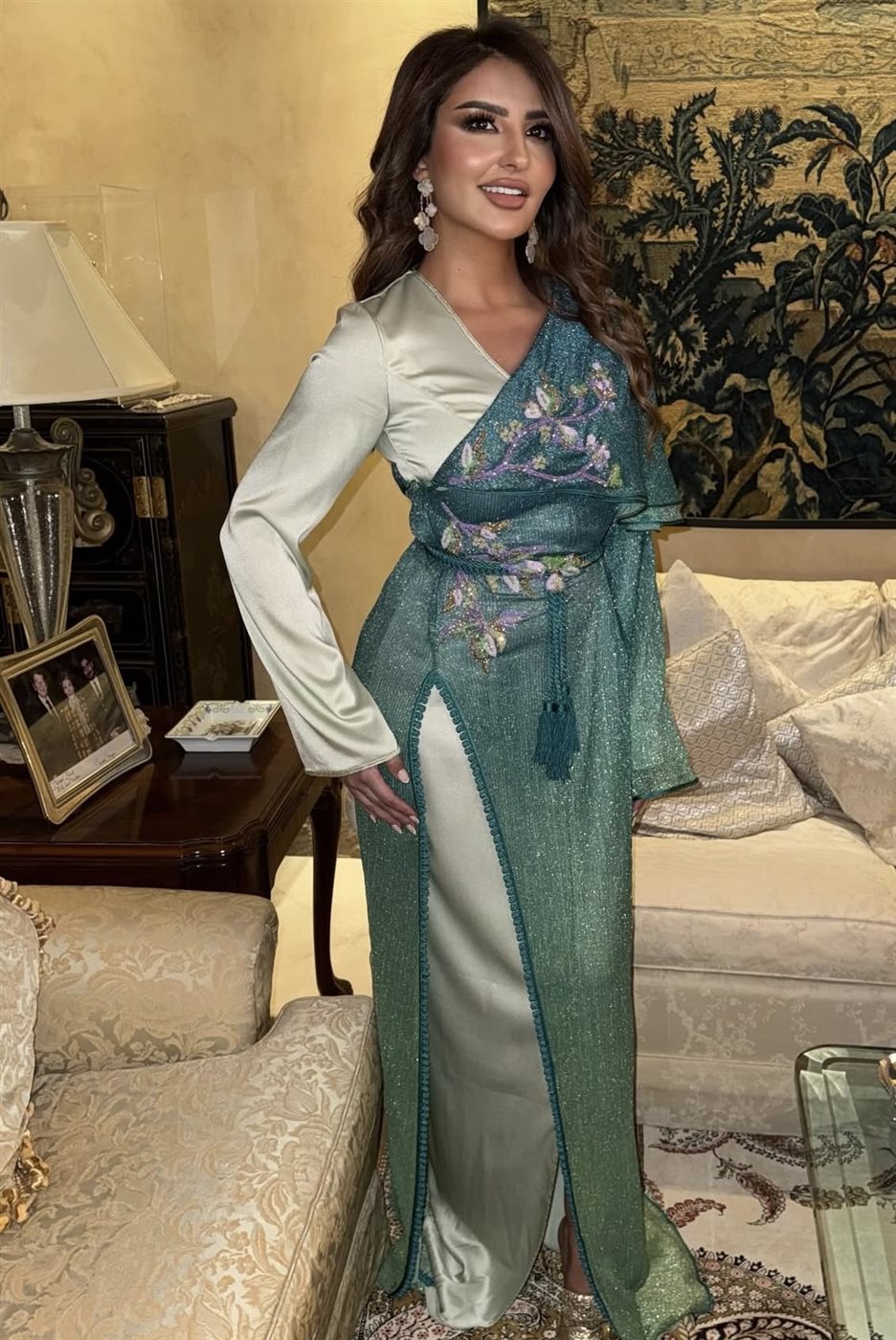اختارت شذى حسون قفطانًا أنيقًا بتدرجات اللون الأخضر، جمع بين النعومة والفخامة في آن واحد، حيث تميز التصميم بقماش لامع وانسيابي يبرز أنوثتها، مع تطريزات دقيقة زادت من ثراء الإطلالة. وجاء القفطان بتفاصيل عصرية أبرزها القصة غير التقليدية التي تمزج بين طبقات مختلفة من الأقمشة، ما منح اللوك طابعًا متجددًا بعيدًا عن النمط الكلاسيكي المعتاد.