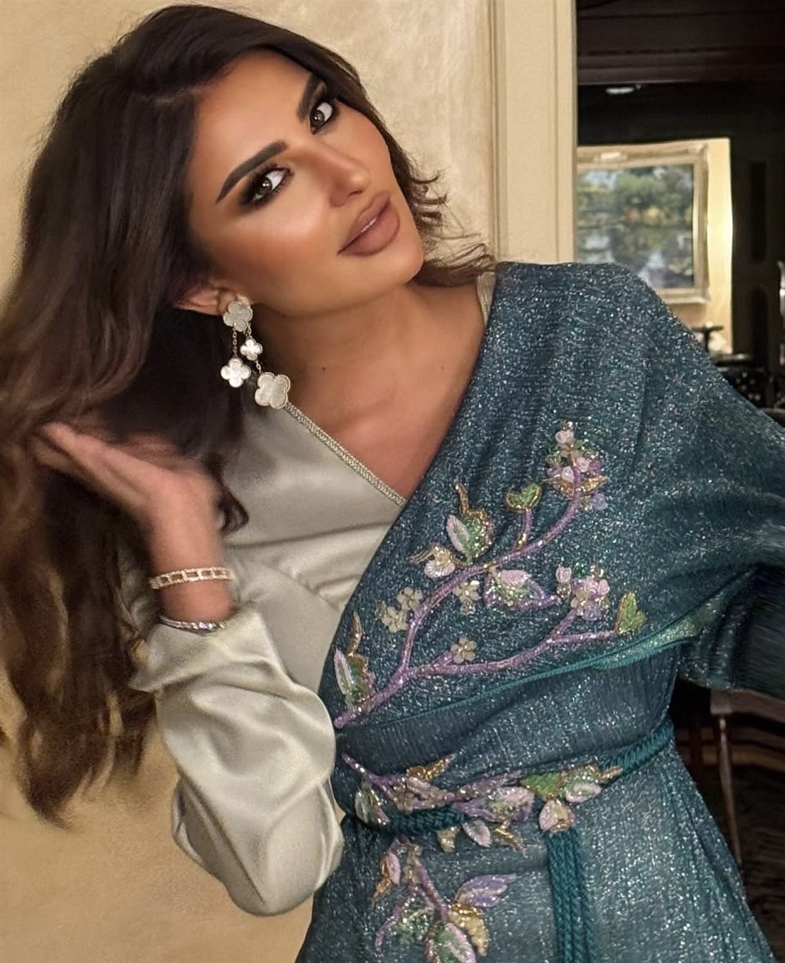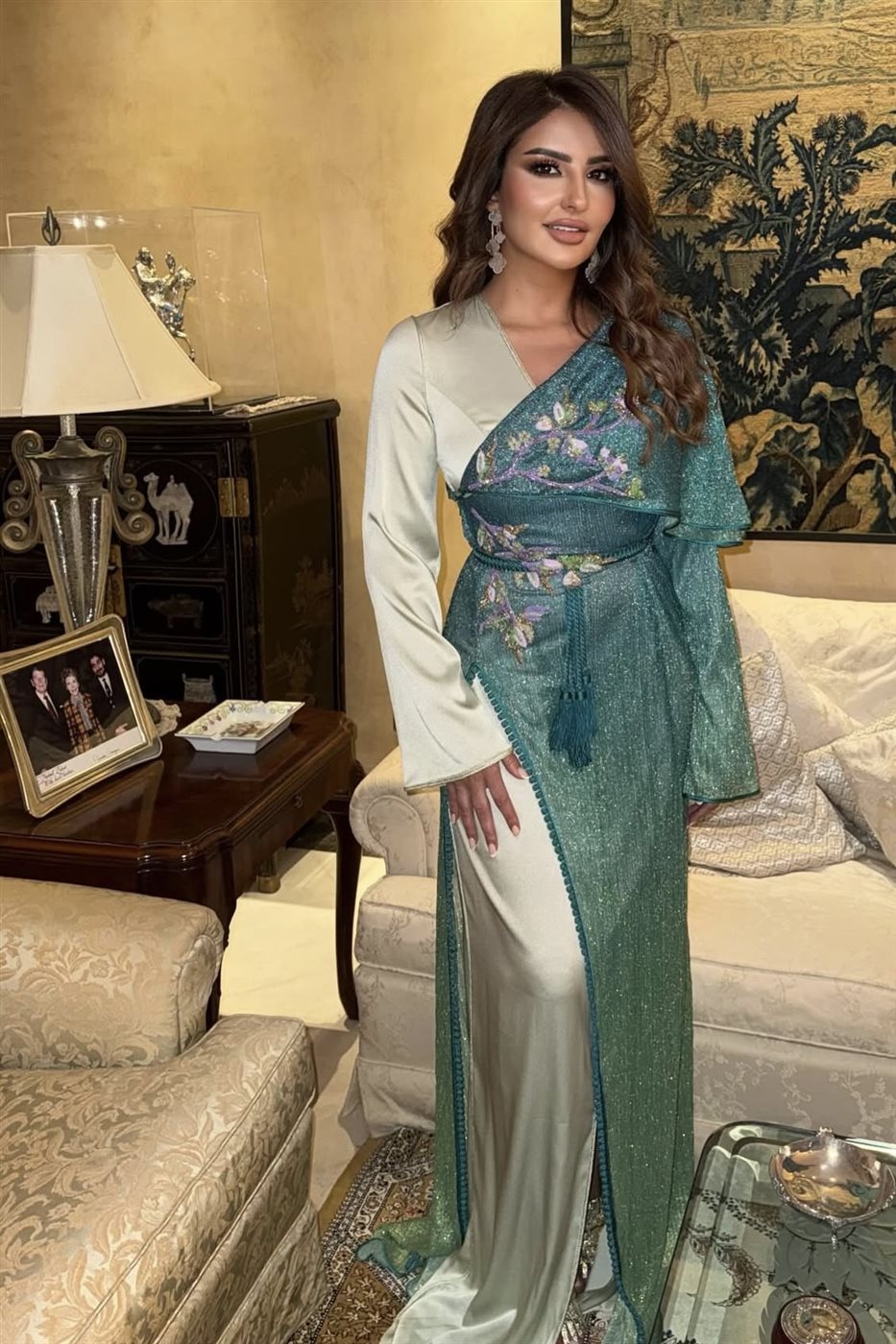 ولم تكتمل الإطلالة دون اختيار حذاء ذهبي لامع، انسجم مع تفاصيل القفطان وأضاف بعدًا إضافيًا من الفخامة، ليؤكد حرصها على تنسيق كل عنصر بعناية. كما ظهر تناغم واضح بين الألوان والخامات، ما يعكس رؤية متكاملة لإطلالة مدروسة بعناية.