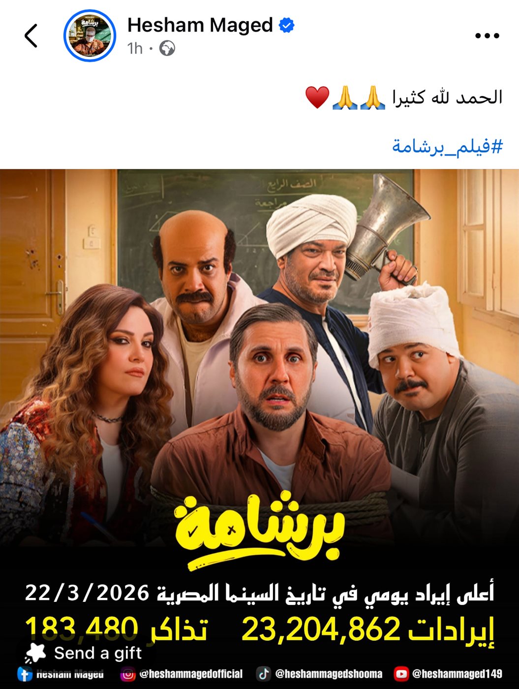 شارك هشام ماجد جمهوره فرحته عبر حسابه الرسمي على موقع “فيسبوك” حيث كتب: “الحمدلله كثيرا فيلم برشامة ” في إشارة إلى الإنجاز الكبير الذي حققه الفيلم خلال فترة عرضه.
