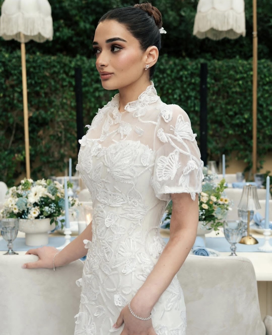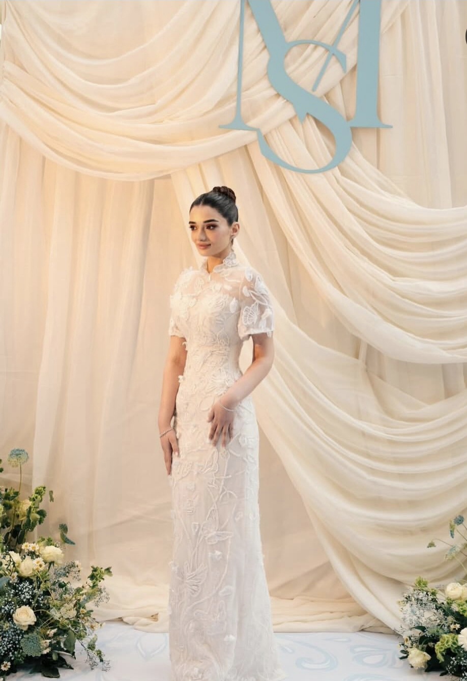 وجاء الفستان بتصميم راقٍ من توقيع دار الأزياء L'ATELIER DE MIA، وتميز بقماش الشيفون الناعم المزخرف بتطريزات دقيقة على شكل ورود وفراشات، ما أضفى عليه طابعًا رومانسيًا جذابًا.