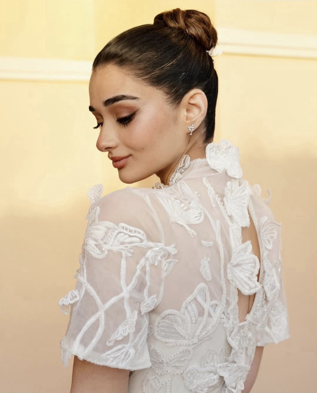 ولم تقتصر جاذبية الإطلالة على الفستان فقط، بل حرصت ملك على تنسيق تفاصيلها بعناية، حيث اختارت تسريحة شعر مرفوعة أبرزت ملامح وجهها بنعومة، خاصة مع وجود قصة رقبة عالية في التصميم، ما أضفى مزيدًا من الأناقة والفخامة.