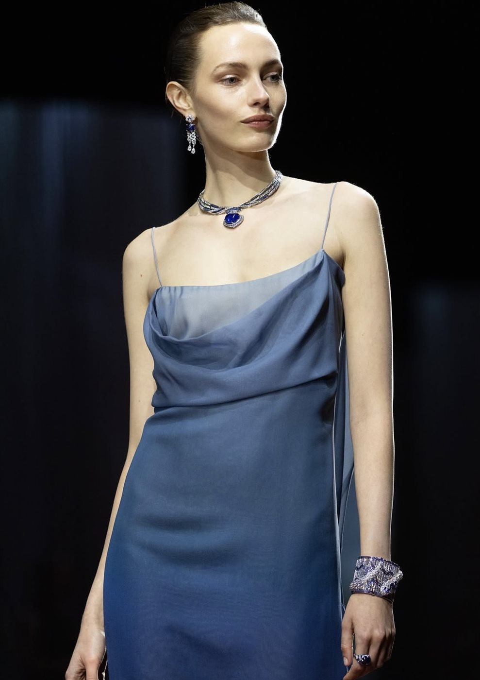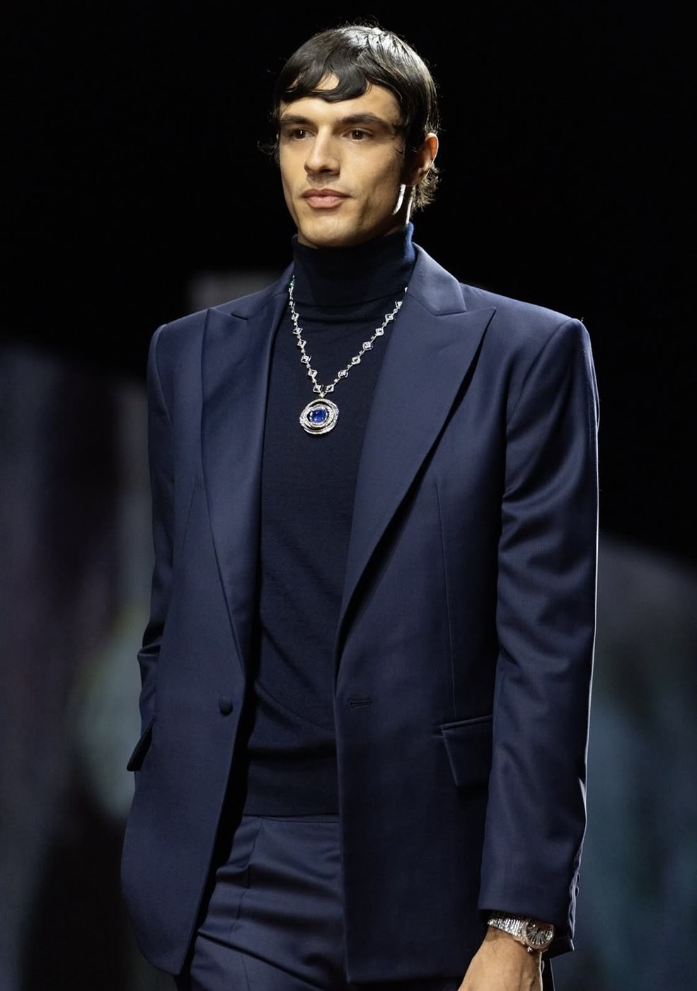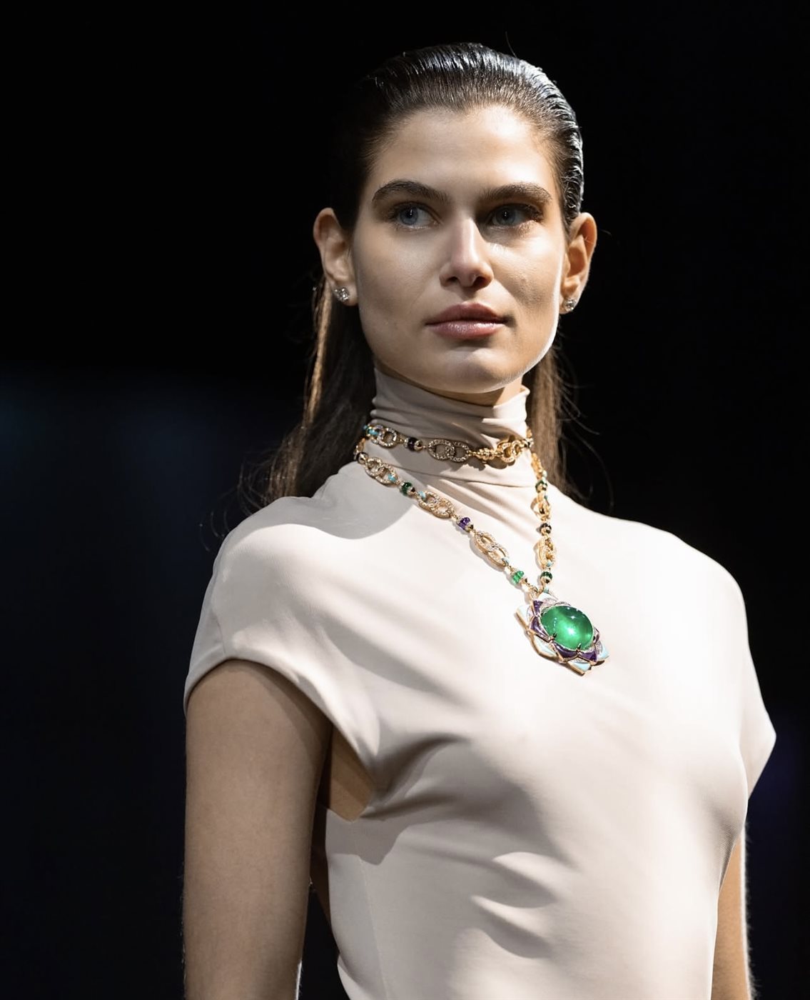 وجاءت هذه الأمسية لتعكس فلسفة Bulgari القائمة على الجرأة في التصميم والقدرة على مزج العناصر المتناقضة في تناغم فريد. فقد برزت الأحجام النحتية للمجوهرات كأعمال فنية قائمة بذاتها، بينما لعبت التكوينات اللونية دورًا محوريًا في إبراز عمق القطع وتعقيدها البصري. الألوان لم تكن مجرد تفاصيل جمالية، بل تحولت إلى لغة تعبيرية تعكس الطاقة والحيوية، في انسجام تام مع الإضاءة المدروسة التي أضفت على كل قطعة بُعدًا دراميًا متغيرًا مع كل حركة.