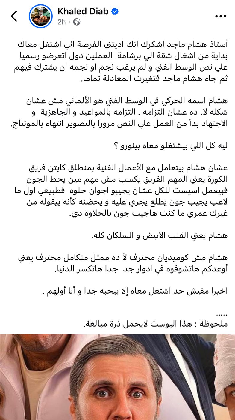 ونشر خالد دياب عبر حسابه على موقع "فيسبوك" رسالة أشاد خلالها بهشام ماجد قائلا:"إن العملين عرضا في البداية على عدد كبير من نجوم الوسط الفني إلا أن الكثير منهم لم يتحمس للمشاركة حتى جاء هشام ماجد وغير مسار المشروع بالكامل".