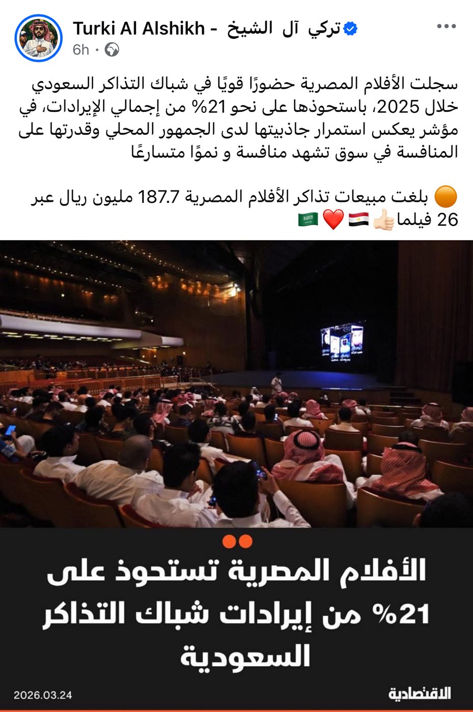 وكشف آل الشيخ عبر حسابه الرسمي على موقع "فيسبوك" أن الأفلام المصرية استحوذت على نحو 21% من إجمالي إيرادات شباك التذاكر في السعودية خلال عام 2025 حيث بلغ عدد الأفلام المعروضة 26 فيلما حققت إجمالي إيرادات وصلت إلى 187.7 مليون ريال سعودي وهو ما يعادل نحو 2.6 مليار جنيه مصري.
