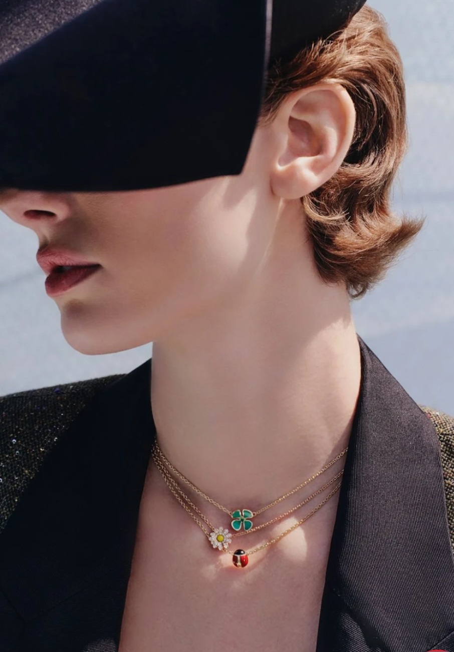 وتستمر المجموعة في تقديم قطع تعكس الأنوثة الراقية، مثل أقراط “Etoile De Vents” المصنوعة من الذهب الوردي والمرصعة بالألماس، والتي تضيف بريقًا ناعمًا دون مبالغة، إلى جانب خواتم “My Dior” التي تأتي بتصاميم متنوعة تمنح حرية الاختيار والتنسيق. كما تحضر قلادة “Diorette” كقطعة مميزة بتفاصيلها الحيوية، حيث تجمع بين الذهب الأصفر واللؤلؤ وطلاء اللاكر متعدد الألوان مع الألماس، ما يمنحها طابعًا صيفيًا مرحًا.