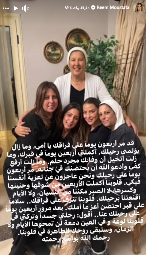 وكتبت ريم مصطفى رسالة مؤثرة لوالدتها رافقتها بصورة تجمعها بشقيقاتها، ونشرتها عبر خاصية "الاستوري" على حسابها الرسمي بموقع "إنستجرام"، قائلة: "مر أربعون يومًا على فراقك يا أمي، وما زال يؤلمني رحيلك، وما زلت أتخيل أن وفاتك مجرد حلم، وما زلت أرفع كفي وأدعو الله أن يحتضنك في جناته".