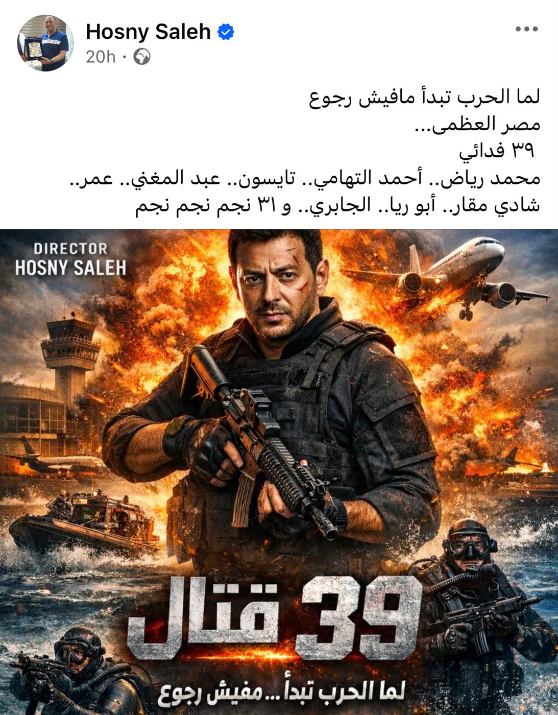 وأرفق صالح البوستر بتعليق لافت قال فيه:"لما الحرب تبدأ مفيش رجوع.. مصر العظمى 39 فدائيا"في إشارة واضحة إلى الطابع الوطني والبطولي الذي يحمله الفيلم.