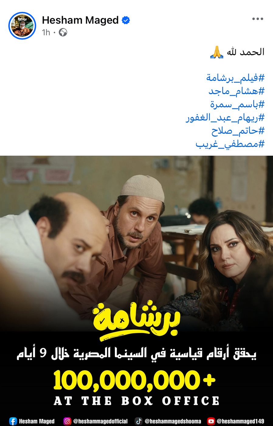 احتفى الفنان هشام ماجد بالنجاح الكبير الذي حققه فيلمه الأخير "برشامة" بعد أن تجاوز حاجز 100 مليون جنيه في شباك التذاكر خلال فترة قصيرة من طرحه ضمن موسم عيد الفطر السينمائي.