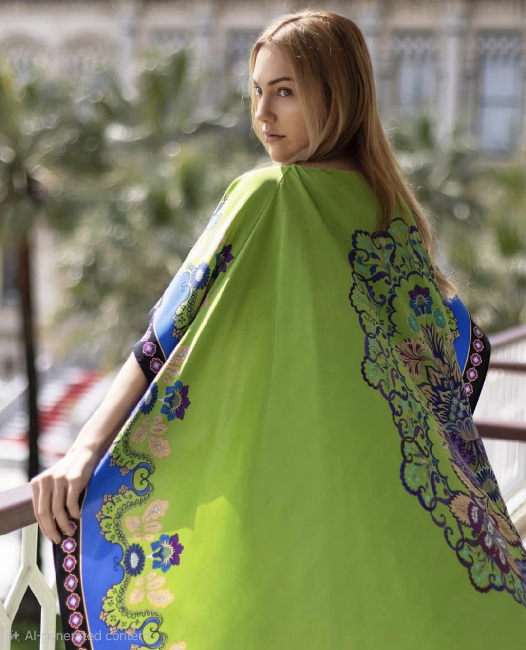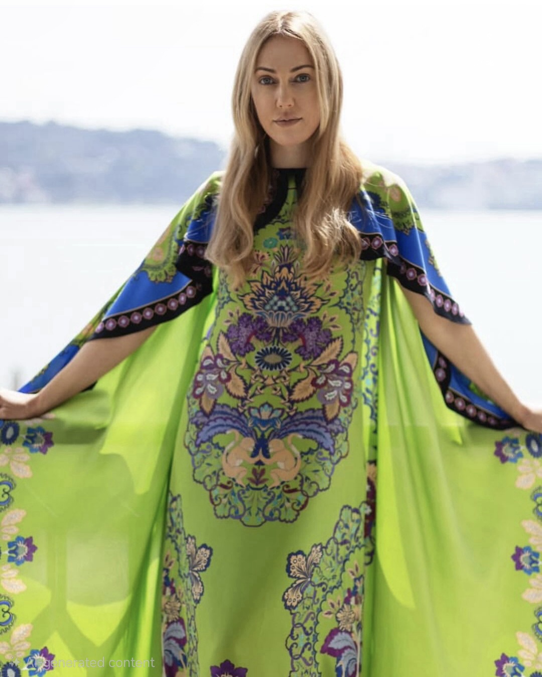 القفطان الذي ارتدته أوزرلي تميز بقصّة واسعة وانسيابية، ما أضفى عليه طابعًا مريحًا وأنيقًا في آنٍ واحد، بينما جاءت الأكمام منسدلة بشكل ناعم يعزز من إحساس الحركة والخفة.