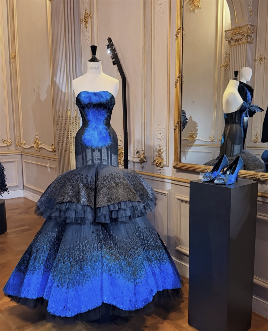 ظهرت زندايا بفستان كروي فاخر من مجموعة الأزياء الراقية لربيع وصيف 2026 من دار سكياباريللي، حمل توقيعًا فنيًا لافتًا مستوحى من عالم الطيور، حيث تميز التصميم بانسيابيته وحضوره المسرحي الذي يعكس خيال الدار وجرأتها المعهودة. وجاء اللون الأزرق ليشكّل العنصر الأخير في معادلة “شيء قديم، شيء جديد، شيء مستعار، شيء أزرق”، وهي الفكرة التي التزمت بها زندايا طوال جولتها الترويجية، ما أضفى بعدًا سرديًا متكاملًا على اختياراتها.