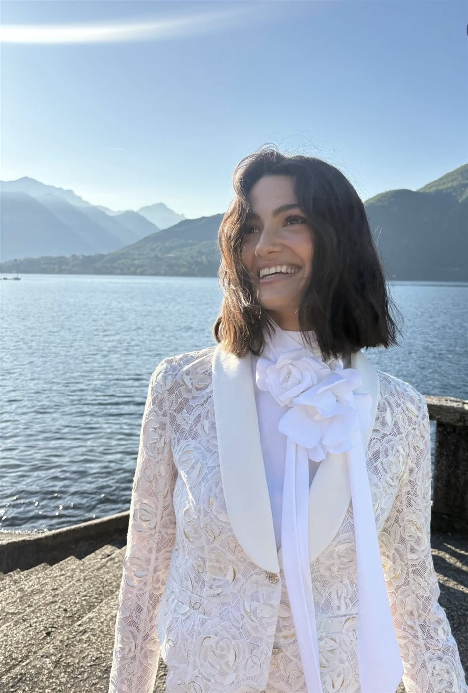 ففي الإطلالة الأولى، ظهرت تارا عماد وسط طبيعة ساحرة، حيث البحيرة والجبال التي تضفي إحساساً بالهدوء والصفاء. ارتدت تصميماً أبيض من الدانتيل، تميز بتفاصيل ناعمة ولمسات رومانسية، مع وشاح طويل مزين بوردة كبيرة عند العنق، ما أضفى على الإطلالة طابعاً شاعرياً أقرب إلى الأحلام. أما من الناحية الجمالية، فجاء المكياج ناعماً وطبيعياً، مع تسريحة شعر بسيطة تعزز من الإحساس بالعفوية، وهو ما يتماشى مع توجهات Chanel Beauty التي تركز على إبراز الجمال الطبيعي دون مبالغة.