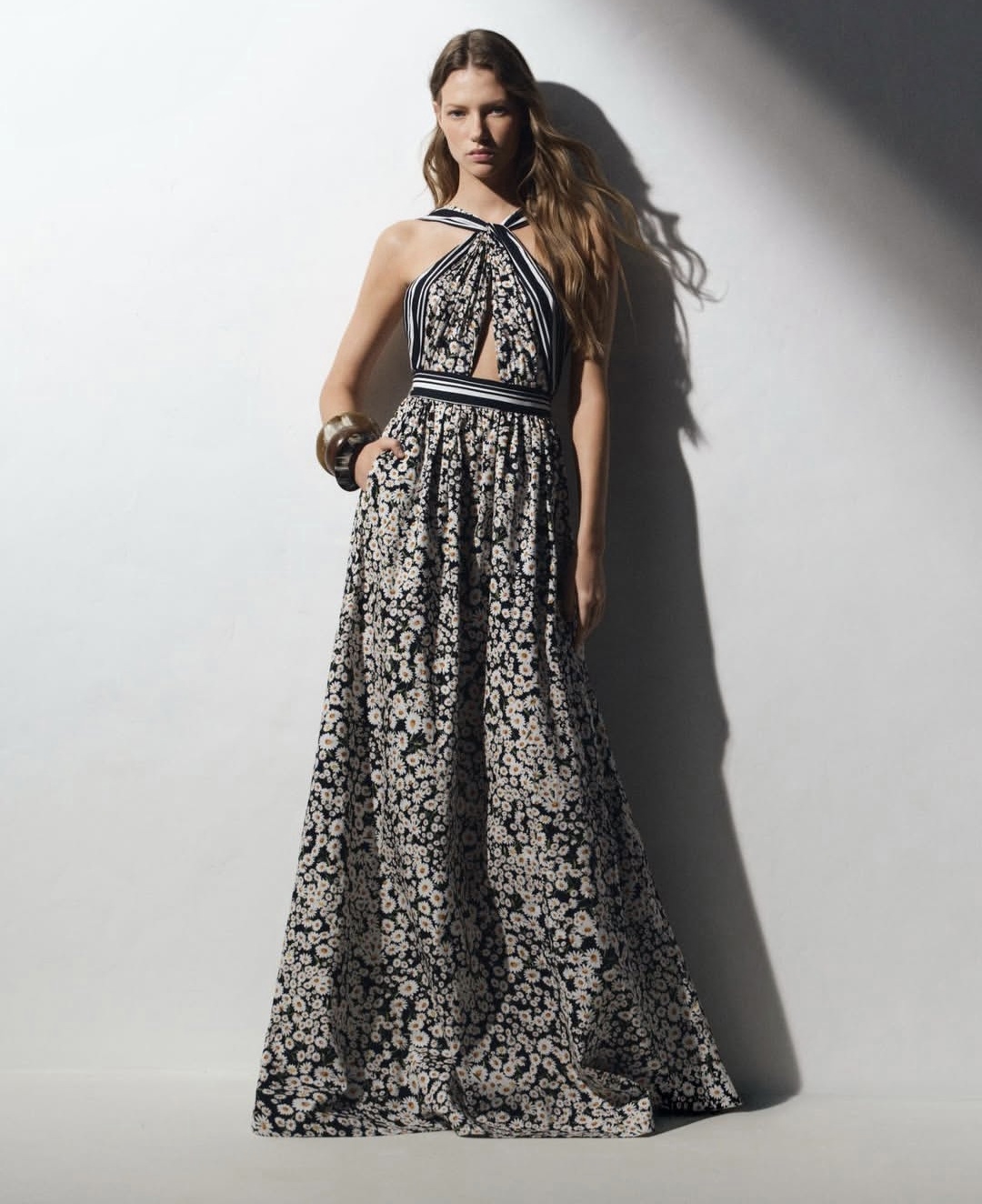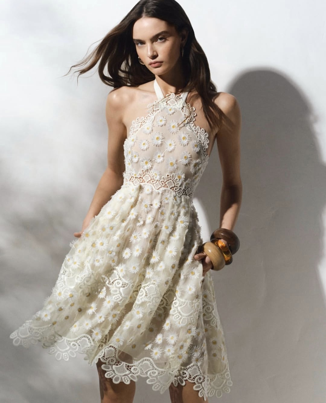 من أبرز عناصر المجموعة نقش زهرة الأقحوان الذي ظهر بشكل متكرر، ليضيف توازناً بين الانتعاش والرقي. هذا النقش الزهري زُين به الفساتين الطويلة والقطع اليومية البسيطة، ما جعلها محببة للارتداء في مختلف المناسبات الصيفية.
