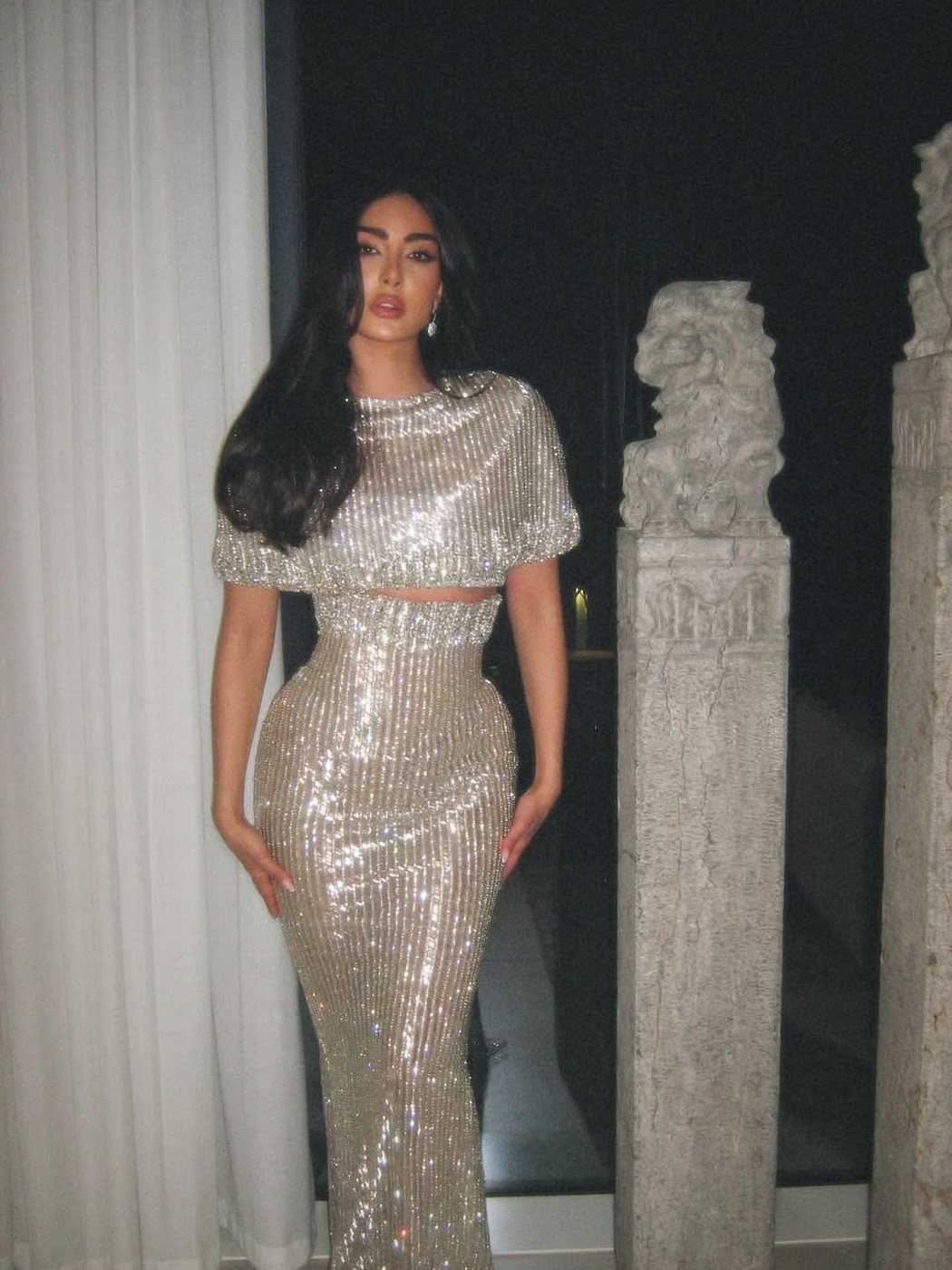 جاء التصميم البرّاق من Mimoza Kadriaj كاختيار مثالي لمناسبة احتفالية، مع دمج بين الفخامة واللمعان بطريقة متقنة، تظهر قدرة الدار على تقديم قطع استثنائية تناسب المناسبات الكبرى.
