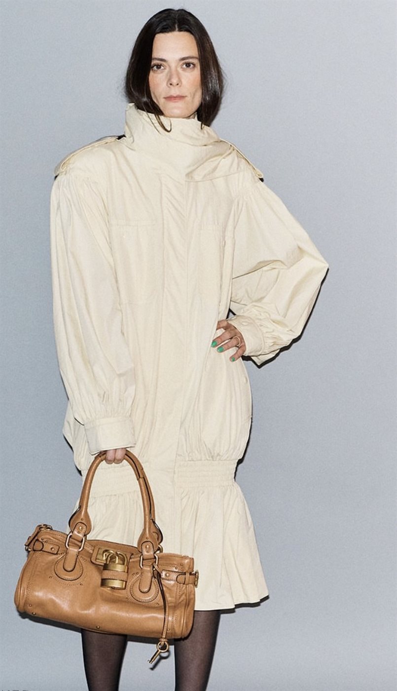 بدلاً من الاعتماد على التفاصيل الصاخبة التي عُرفت بها تلك الفترة، مثل الأكتاف الضخمة والأقمشة المعدنية اللامعة، تتجه هذه الرؤية إلى إبراز الأناقة من خلال قصّات مدروسة وتفاصيل ناعمة تحمل روح الماضي دون أن تكررها حرفيًا. ويأتي معطف Chloe عالي الياقة في قلب هذا التوجه، حيث يجمع بين الخصر المنخفض المزموم، والأكمام الواسعة التي تضيف بعدًا دراميًا، إلى جانب تفصيل الوشاح الذي يمنح القطعة طابعًا متجدّدًا.