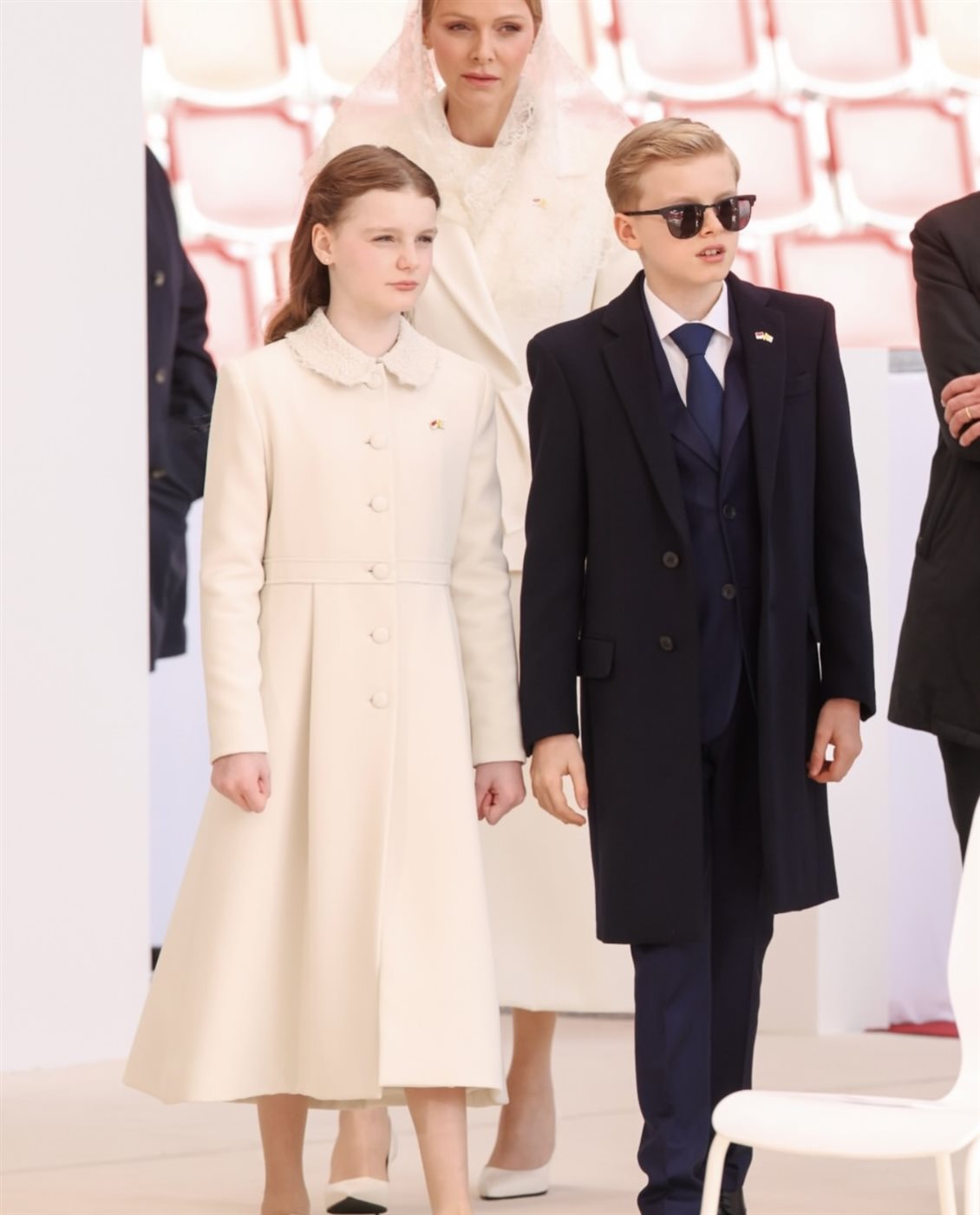 وقد تميّزت إطلالة الأميرة شارلين باللون الأبيض الكلاسيكي، الذي لطالما ارتبط بالهيبة والبساطة الراقية، حيث ارتدت تصميماً أنيقاً تميز بقصّة نظيفة وتفاصيل دقيقة، أضفت عليها طابعاً ملكياً معاصراً. وأكملت الإطلالة بغطاء رأس ناعم ونظارات شمسية كبيرة، ما منحها حضوراً واثقاً يعكس شخصيتها الهادئة والقوية في آنٍ واحد. أما الأميرة غابرييلا، فقد بدت كنسخة مصغّرة من والدتها، بإطلالة متناسقة باللون نفسه، جسدت براءة الطفولة وأناقة البروتوكول الملكي في توازن لافت.