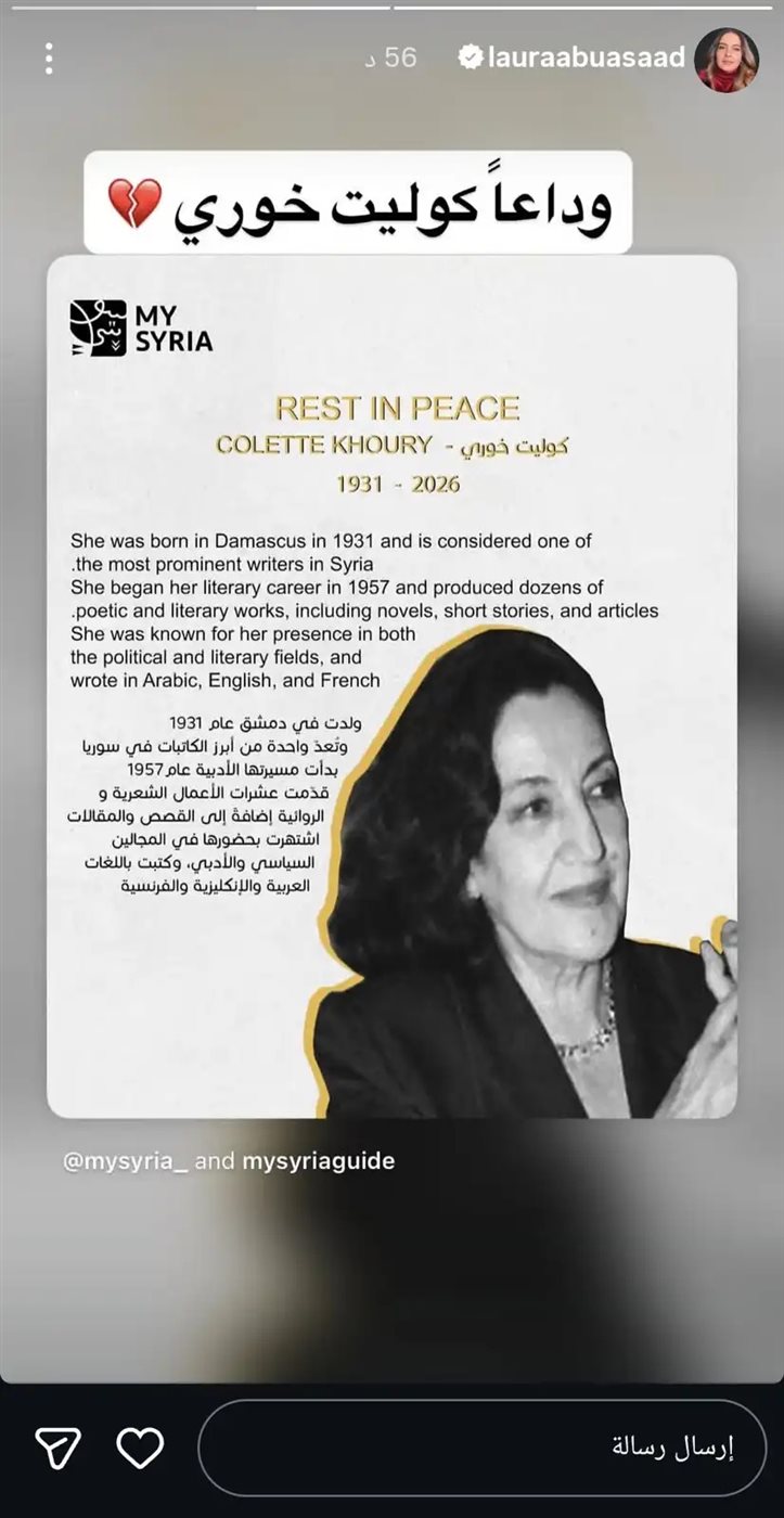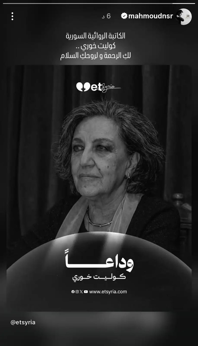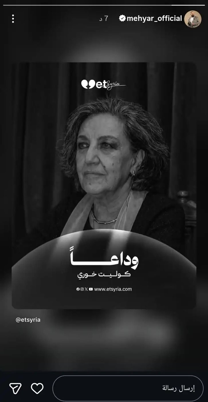 كما ودعها الفنان مهيار خضور برسالة قصيرة عبر "ستوري" قال فيها:"وداعا كوليت خوري".