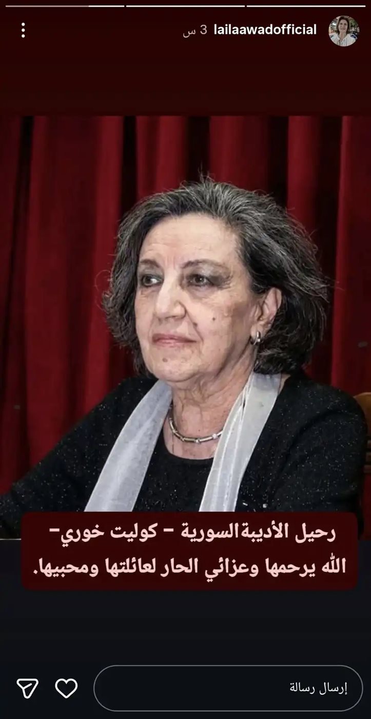واكتفت الفنانة لورا أبو أسعد بكلمات مقتضبة عبر "ستوري" قائلة: "وداعا كوليت خوري".