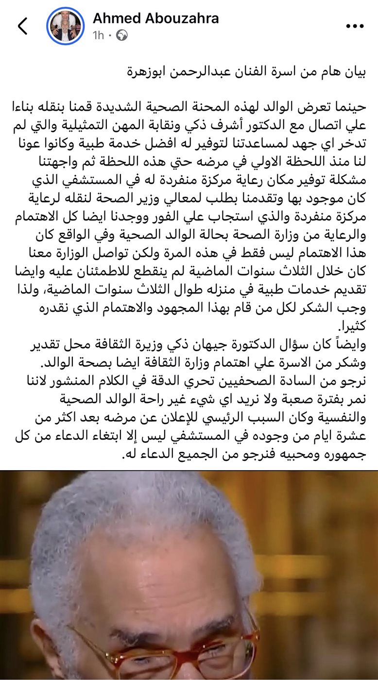 أصدرت أسرة الفنان الكبير عبدالرحمن أبو زهرة بيانا رسميا كشفت خلاله عن تعرضه لوعكة صحية شديدة استدعت نقله إلى المستشفى لتلقي الرعاية الطبية اللازمة وسط حالة من القلق بين محبيه.