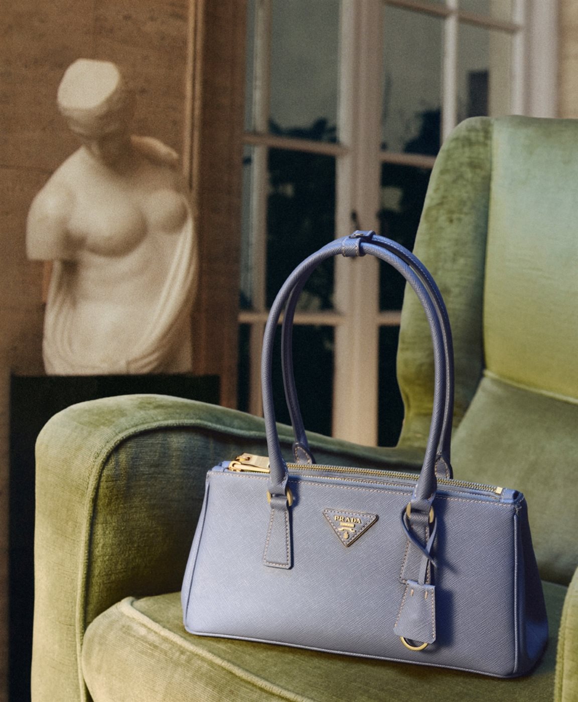 وفي هذه الحملة، يظهر التصميم في مشهد أقرب إلى لوحة فنية، حيث توضع الحقيبة داخل مساحة داخلية كلاسيكية تضم عناصر فنية مثل التماثيل والنوافذ ذات الطابع الأوروبي، إلى جانب مقعد مخملي بلون أخضر غني. هذا التكوين البصري لا يأتي مصادفة، بل يعكس حوارًا بين الماضي والحاضر، حيث تتجاور الفنون الكلاسيكية مع تصميم معاصر في تناغم بصري يعبر عن فلسفة Prada.