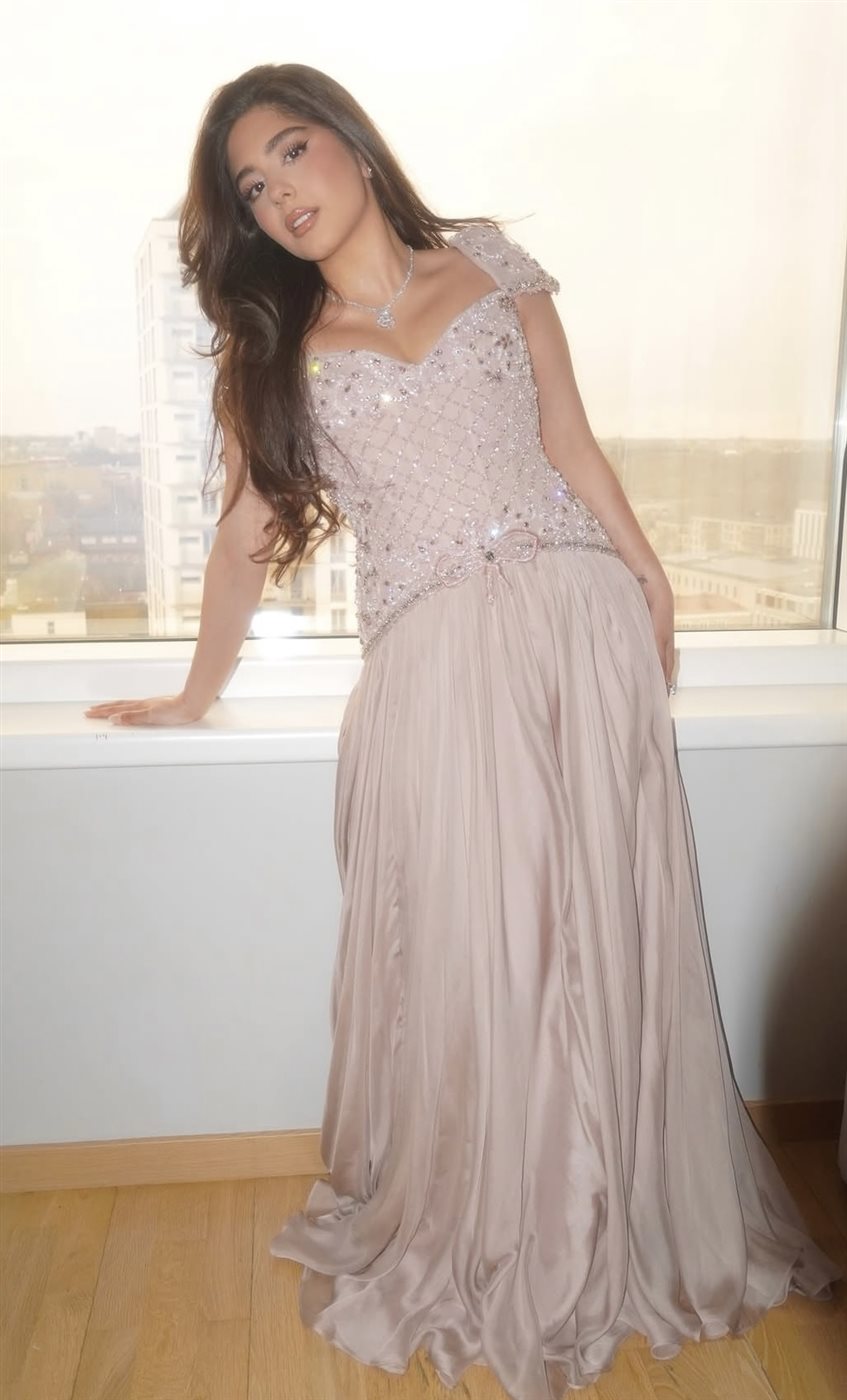 اختارت مايان فستانًا طويلًا بتدرجات لونية ناعمة تميل إلى البيج الوردي، جاء بتصميم أنثوي دقيق يعكس روح الفخامة الهادئة. تميز الجزء العلوي من الفستان بتطريزات لامعة على هيئة شبكة هندسية، مع ياقة مفتوحة وأكتاف مزينة بتفاصيل ناعمة أضفت لمسة رومانسية على الإطلالة. أما الجزء السفلي، فجاء بانسيابية واضحة من قماش حريري ناعم، منحها حركة خفيفة وانسيابية أنيقة أثناء الوقوف والتصوير.
