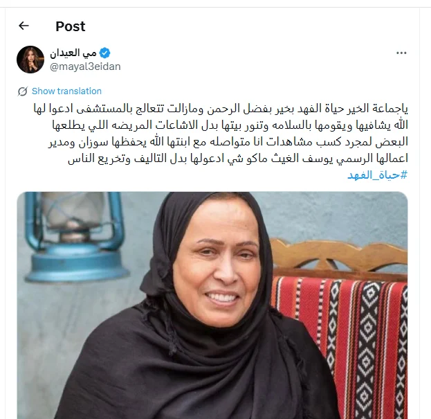 وخرجت مي العيدان للرد على أنباء وفاة حياة الفهد من خلال منشور لها عبر حسابها الرسمي على موقع التغريدات القصيرة “إكس”، وعلقت قائلة: “يا جماعة الخير حياة الفهد بخير بفضل الرحمن ومازالت تتعالج بالمستشفى ادعوا لها الله يشافيها ويقومها بالسلامة وتنور بيتها بدل الإشاعات المريضة اللي يطلعها البعض لمجرد كسب مشاهدات”.
