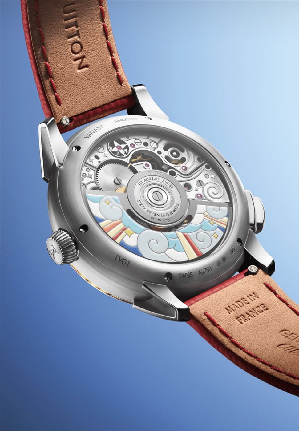 ومن الناحية التقنية، تكشف الجهة الخلفية عن حركة ميكانيكية متقنة الصنع، تعكس خبرة الدار في صناعة الساعات الفاخرة. وقد تم تطوير هذه الآلية داخل مشاغل La Fabrique du Temps، ما يؤكد التزام Louis Vuitton بتعزيز مكانتها في عالم الهورولوجي، وليس فقط في عالم الموضة. الحركة مزينة بتفاصيل فنية دقيقة، مع لمسات لونية تتناغم مع تصميم الميناء الأمامي، في استمرارية بصرية مدروسة.