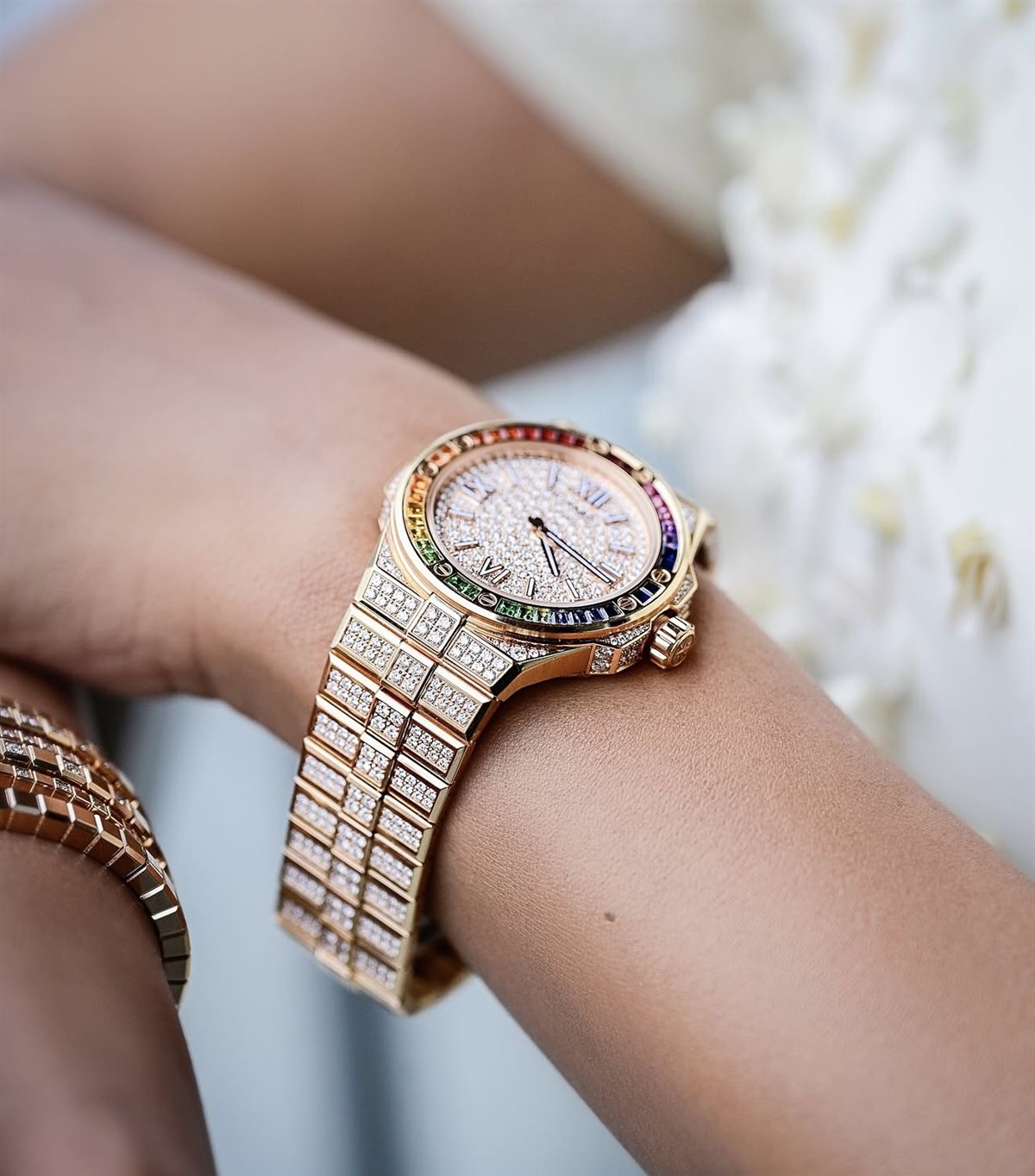 ولم تكتمل الإطلالة دون حضور الساعة الفاخرة، التي برزت بتصميمها الذهبي المرصع بالألماس، لتؤكد مكانة الدار في عالم الساعات الراقية. الساعة لم تكن مجرد إكسسوار، بل عنصرًا أساسيًا في تكوين الإطلالة، خاصة مع تفاصيلها الدقيقة التي تعكس الضوء وتمنح إحساسًا بالحركة والرقي.