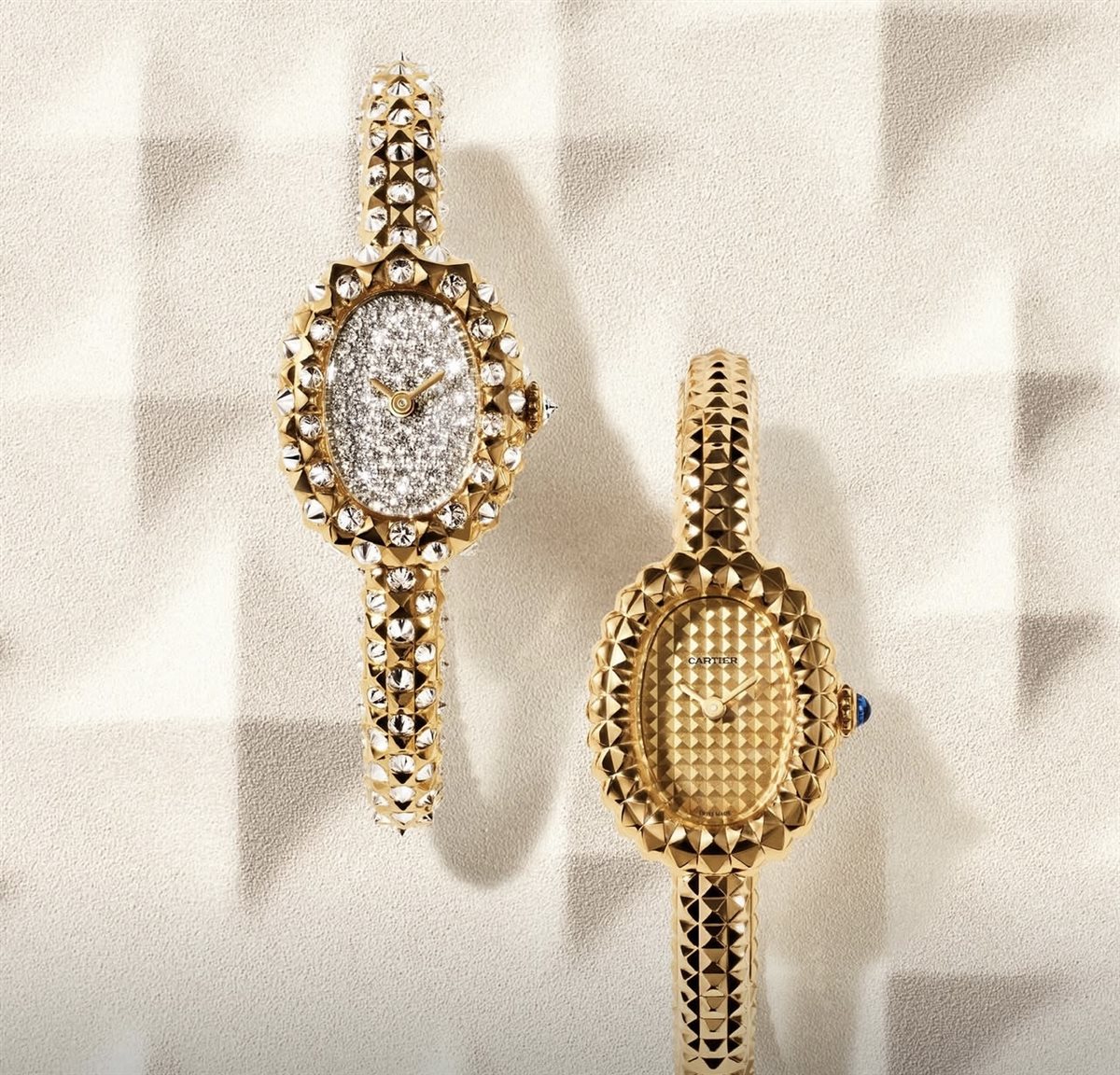 وقد برزت في المعرض ساعة Cartier Baignoire كواحدة من أبرز القطع التي جسدت هذا التوجه، حيث أعادت دار Cartier تقديمها بتصميم أكثر جرأة، مع سطح ذهبي محفور بنقوش هندسية بارزة، وأحياناً مرصع بالأحجار الكريمة التي تضيف بريقاً استثنائياً. هذا التصميم يعكس توازناً بين الكلاسيكية التي اشتهرت بها كارتييه، واللمسة الحديثة التي تتماشى مع ذوق الجيل الجديد.