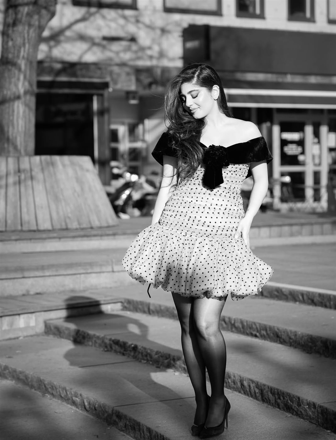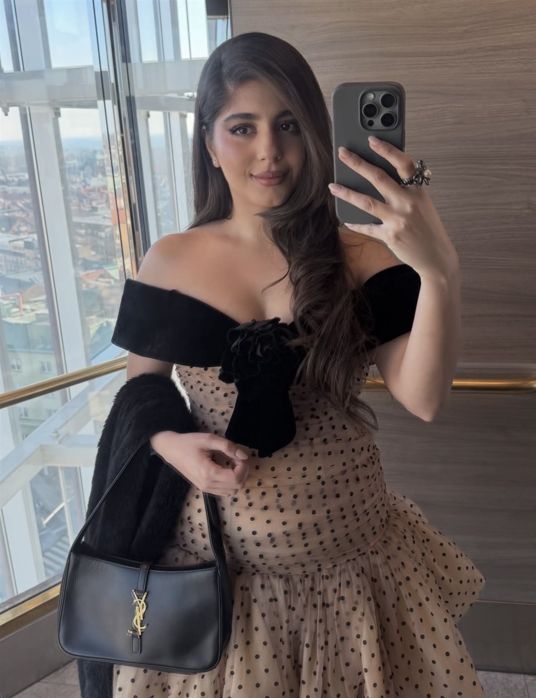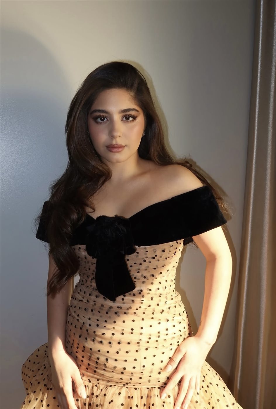 وجاءت إطلالة مايان مفعمة بالبساطة والرقي، إذ اختارت فستانًا أنيقًا بتصميم أوف شولدر باللون البيج المزين بنقاط سوداء صغيرة، وهو ما أضفى طابعًا كلاسيكيًا ناعمًا على مظهرها. وتميز الفستان بعقدة سوداء بارزة عند منطقة الصدر، ما أضاف لمسة درامية أنيقة أكملت تفاصيل الإطلالة. كما جاء تصميم الفستان من دار أزياء Rosario، ليعكس ذوقًا راقيًا يمزج بين الكلاسيكية والعصرية.