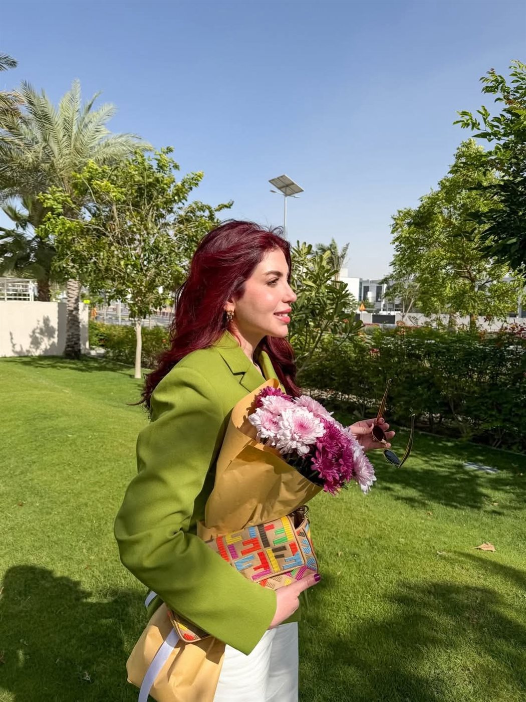 وجاء اختيارها موفقًا، خاصة مع تنسيقه مع بنطال واسع الأرجل باللون الأبيض، ما أضفى توازنًا بصريًا مريحًا بين الجرأة والهدوء، وسمح للّون الأخضر بأن يكون نجم الإطلالة