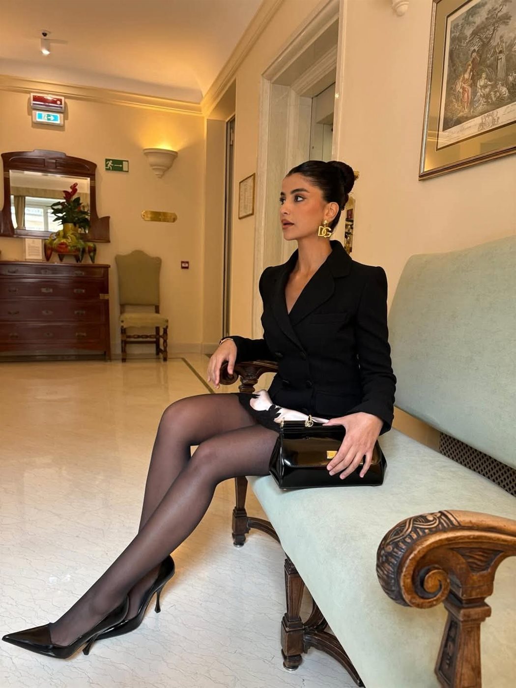 ونسّقت فرحات هذه القطعة مع بليزر أسود بقصة Double Breasted، أضفى على الإطلالة لمسة رسمية متوازنة، وكسر نعومة التنورة بأسلوب يعكس ثقة واضحة في اختيار القطع.