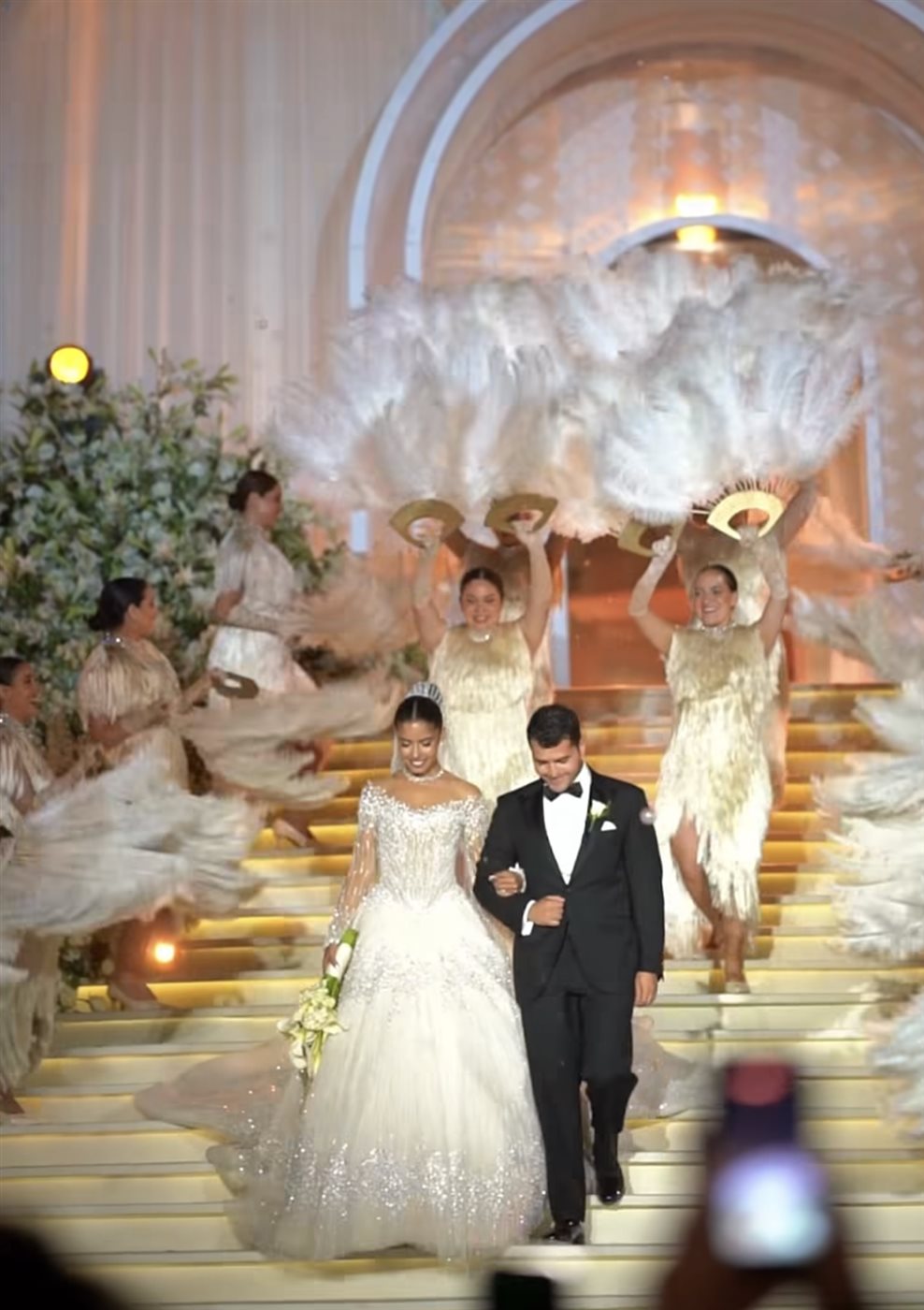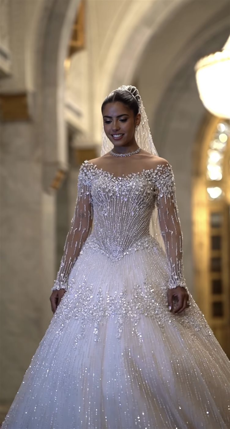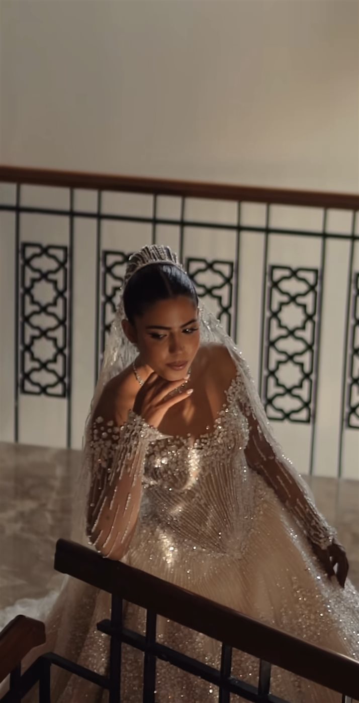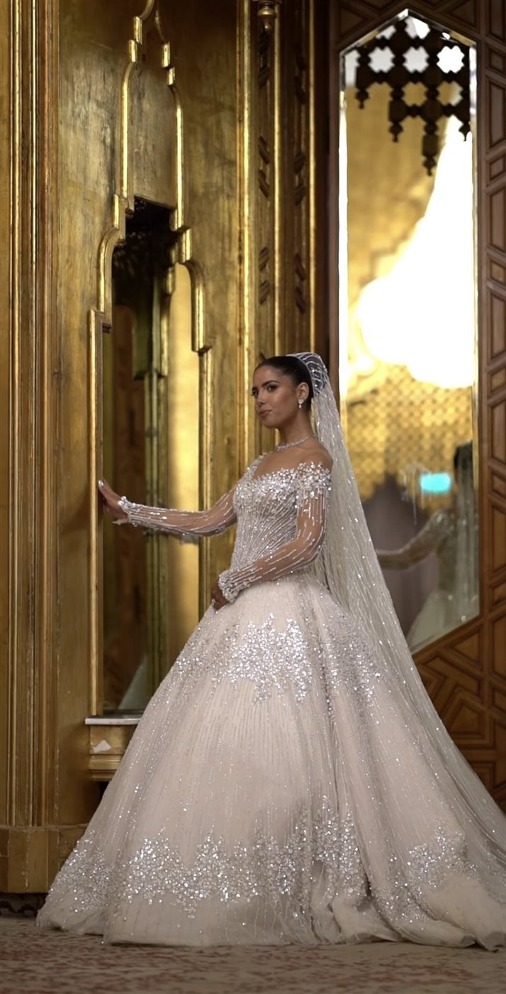أما التنورة، فجاءت واسعة بطبقات من التول المطرز، مزينة بتفاصيل لامعة متدرجة أضفت بريقًا ساحرًا مع كل حركة، إلى جانب ذيل طويل منح الإطلالة طابعًا ملكيًا واضحًا. واكتملت الإطلالة بطرحة طويلة انسيابية، تناغمت مع تفاصيل الفستان دون مبالغة، لتخلق مظهرًا متوازنًا يجمع بين الفخامة والنعومة.