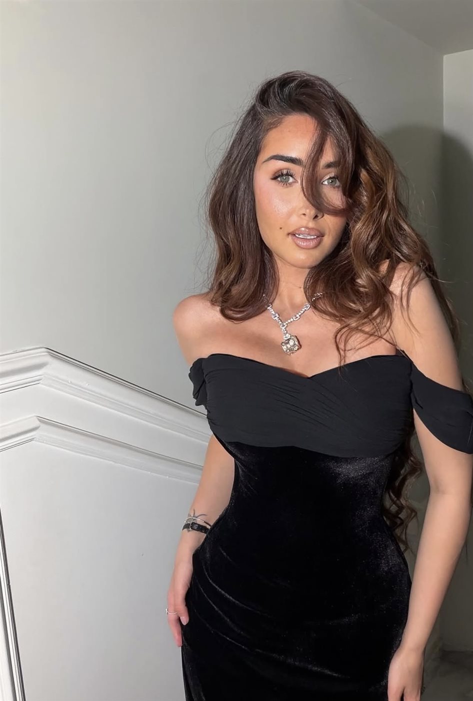 وقد ظهرت هنا الزاهد بفستان أسود بتصميم أوف شولدر، جاء بقصة ضيقة أبرزت رشاقتها بشكل واضح، مع خامة مخملية أضفت عمقًا وأناقة فاخرة على الإطلالة. وقد تميز الفستان بتفاصيل ناعمة بعيدة عن التعقيد، ما منحها حضورًا هادئًا لكنه لافت في الوقت نفسه، خاصة مع الانسيابية التي أظهرها التصميم في الجزء السفلي.