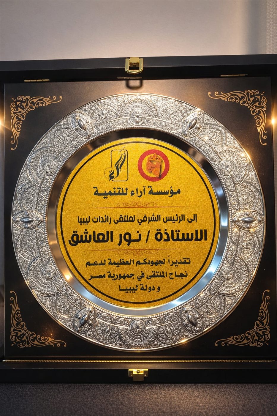 كرم ملتقى رائدات ليبيا، الأستاذة نور العاشق الرئيس الشرفي للملتقى ورئيس مجلس إدارة “ترند ريل”، التي انطلقت فعالياته مؤخرًا في مدينة بني غازي في ليبيا بمشاركة واسعة من سيدات من مختلف أنحاء البلاد وبوجود شخصيات سياسية ومجتمعية كبرى خلال الملتقى.