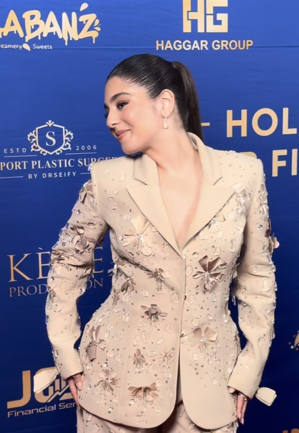 فقد اختارت مايان بدلة باللون البيج، جاءت بتصميم كلاسيكي مكون من جاكيت مفصل وبنطال واسع، إلا أن التفاصيل الدقيقة هي ما منحت الإطلالة طابعها الخاص. فقد زُينت البدلة بالكامل بتطريزات ناعمة على شكل ورود، أضافت لمسة أنثوية رقيقة كسرت حدة الطابع الرسمي للبدلة، وجعلتها تبدو أقرب إلى أزياء السهرة الراقية.