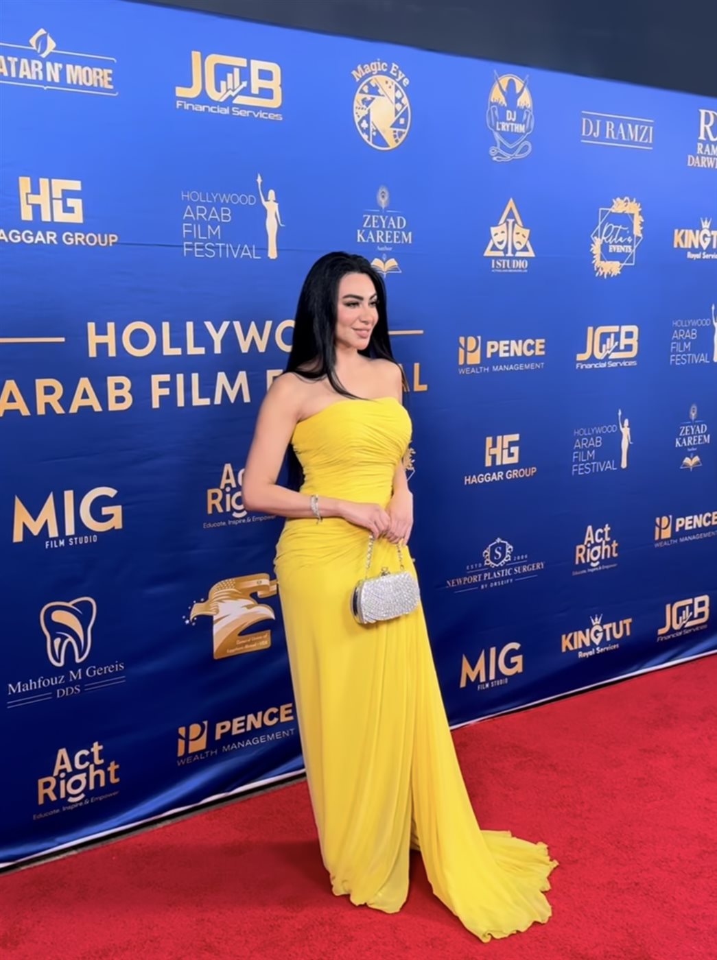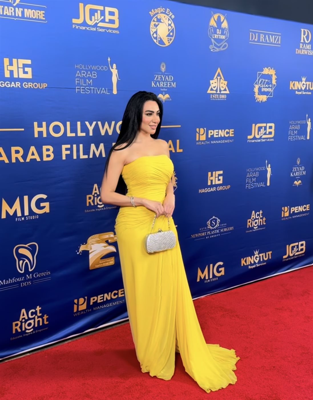 ولإكمال اللوك، اعتمدت حقيبة صغيرة مرصعة باللمعان باللون الفضي، أضافت لمسة فخامة متناغمة مع اللون الأصفر، إلى جانب إكسسوارات بسيطة تمثلت في سوار أنيق، ما ساهم في إبراز التفاصيل دون تشتيت الانتباه.