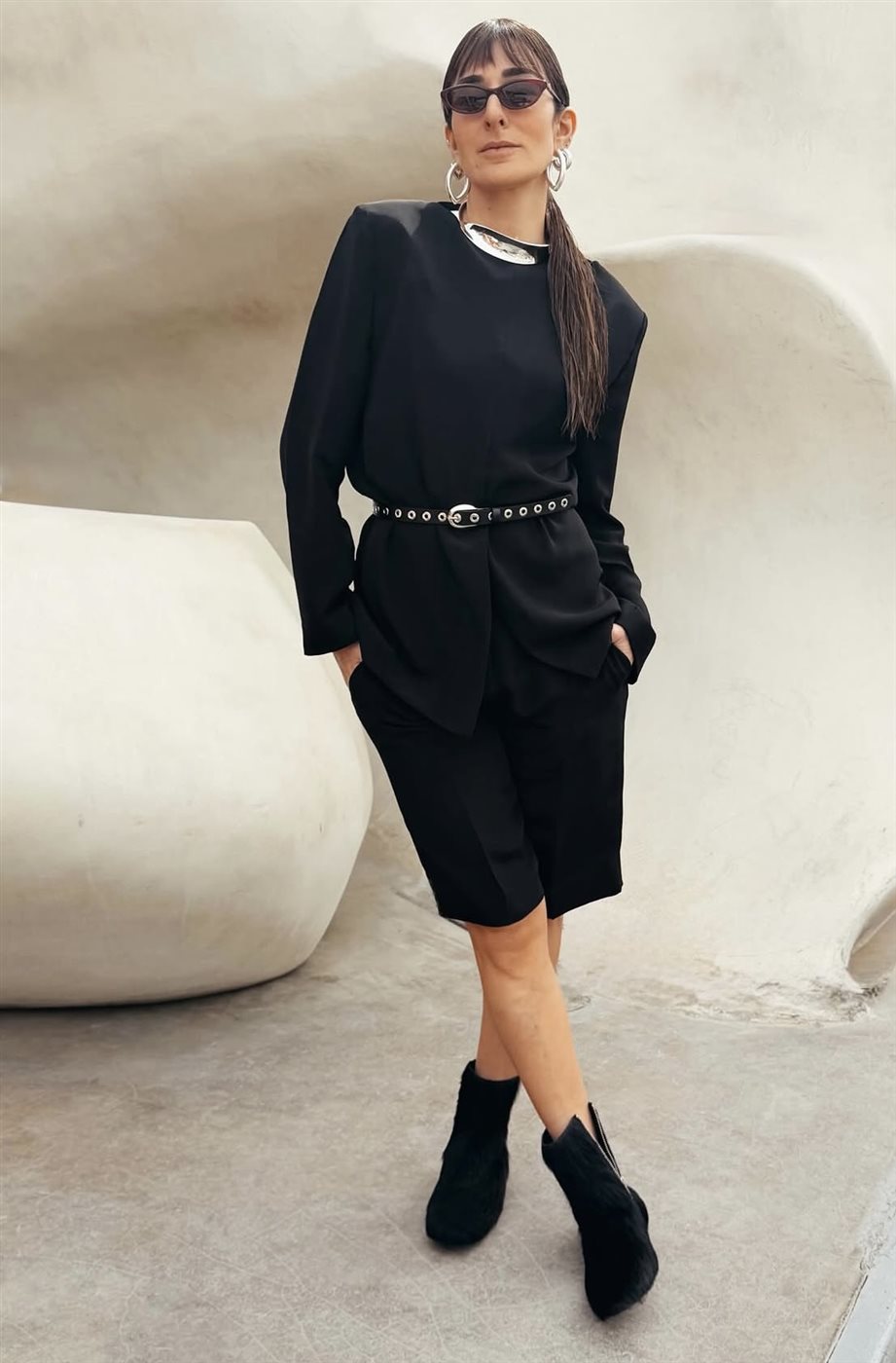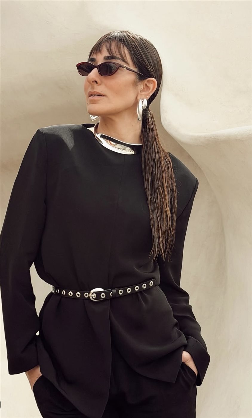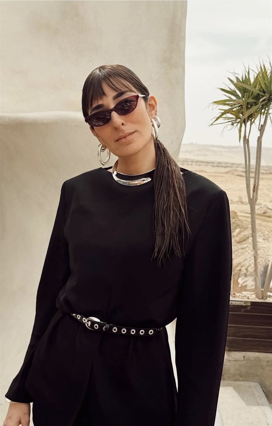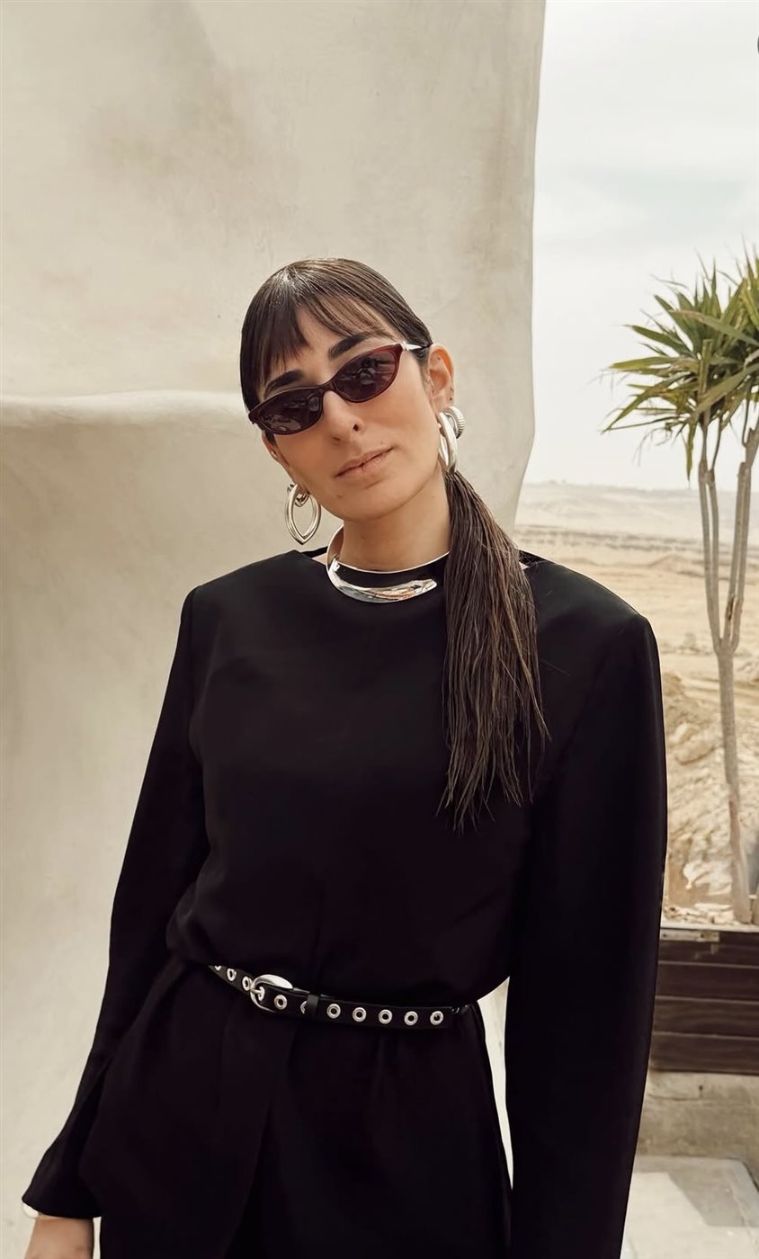 وقد اعتمدت أمينة خليل في إطلالتها الأولى على طقم أسود بتصميم انسيابي، تميز بقصّة نظيفة وخطوط واضحة، مع حزام عند الخصر أضفى لمسة عصرية أبرزت القوام بشكل أنيق. ونسّقت الإطلالة مع نظارة شمسية صغيرة ذات طابع كلاسيكي، إلى جانب مجوهرات فضية بارزة جاءت بتصميم عصري يعكس روح العلامة. أما تسريحة الشعر فجاءت بسيطة ومشدودة للخلف، مما أتاح التركيز على ملامح الوجه والإكسسوارات.