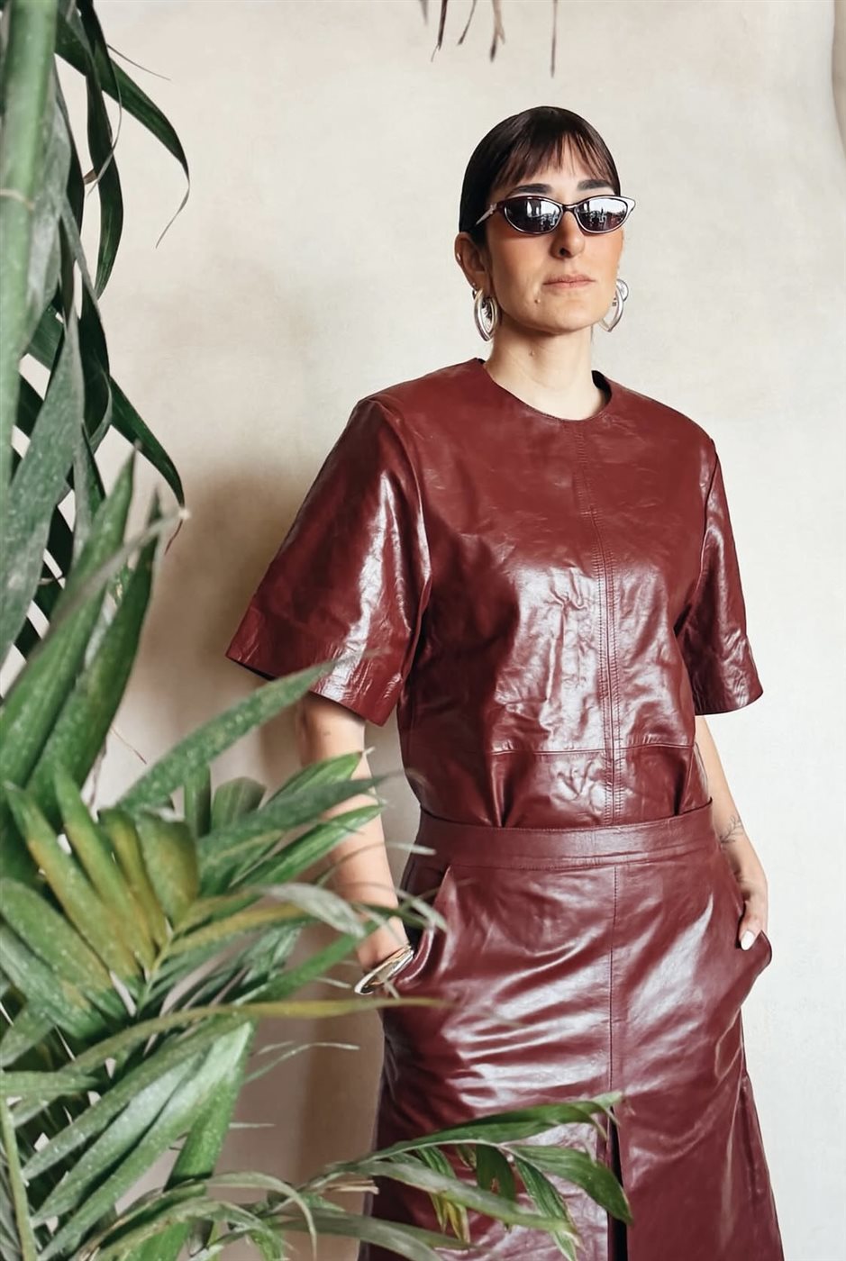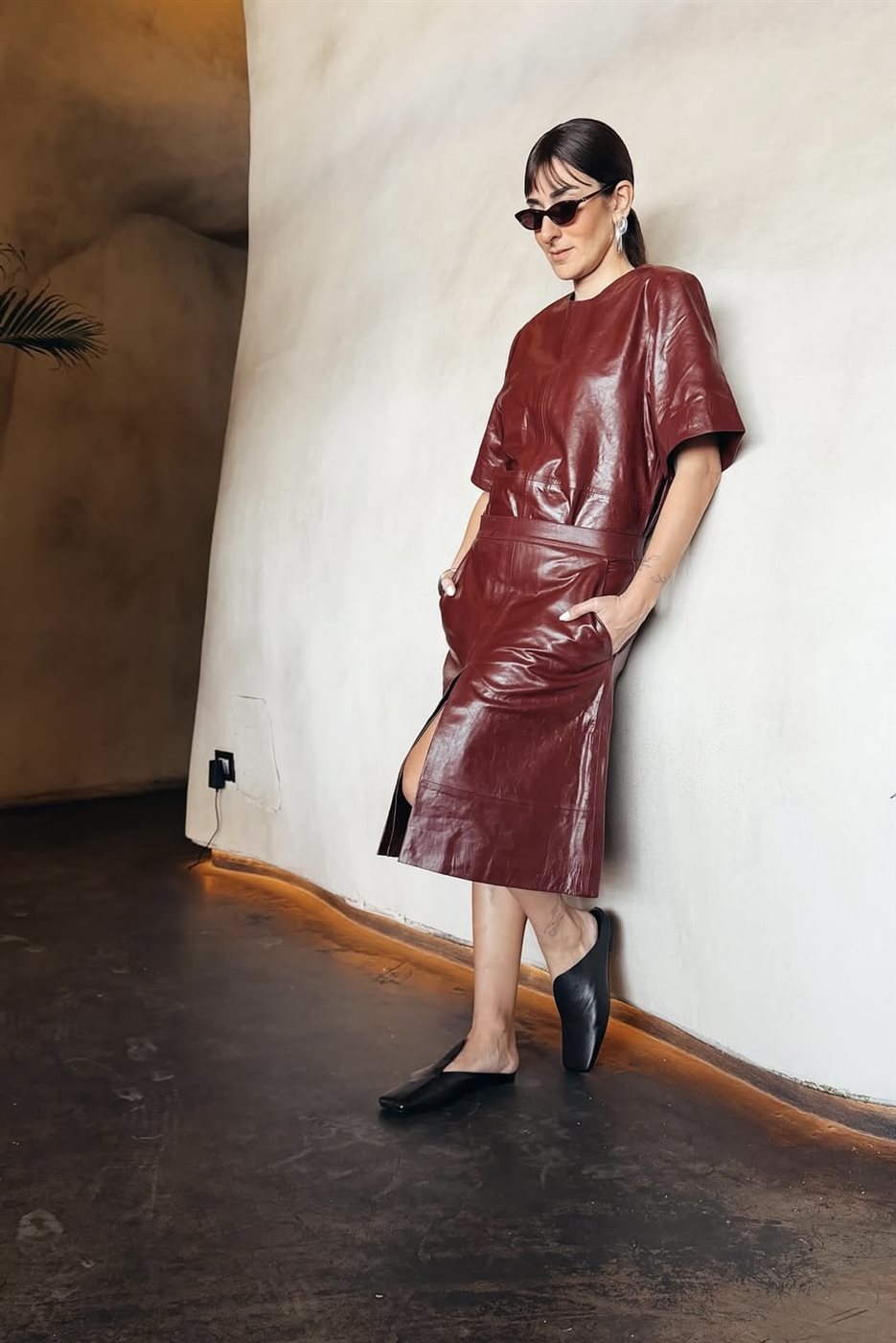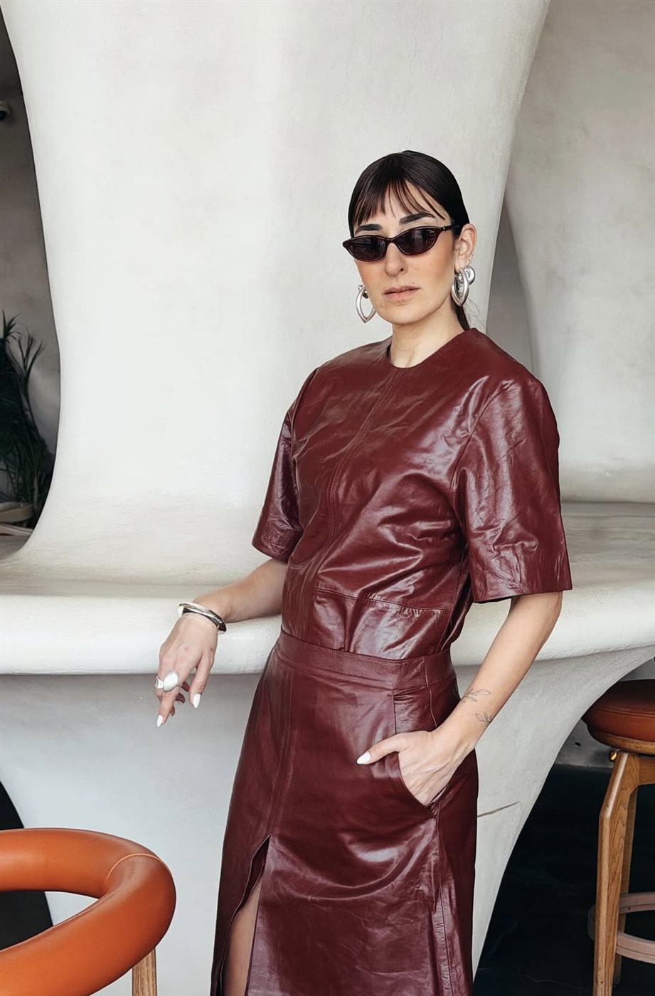وفي إطلالة أخرى، اختارت أمينة فستانًا جلديًا باللون العنابي، حمل توقيعًا جريئًا من حيث الخامة والتصميم، حيث جمع بين البنية القوية والتفاصيل الأنثوية، مع قصة مريحة وأنيقة في الوقت ذاته. هذا التنوع في الإطلالات يعكس قدرة أمينة خليل على التنقل بين الأساليب المختلفة دون فقدان هويتها الخاصة.