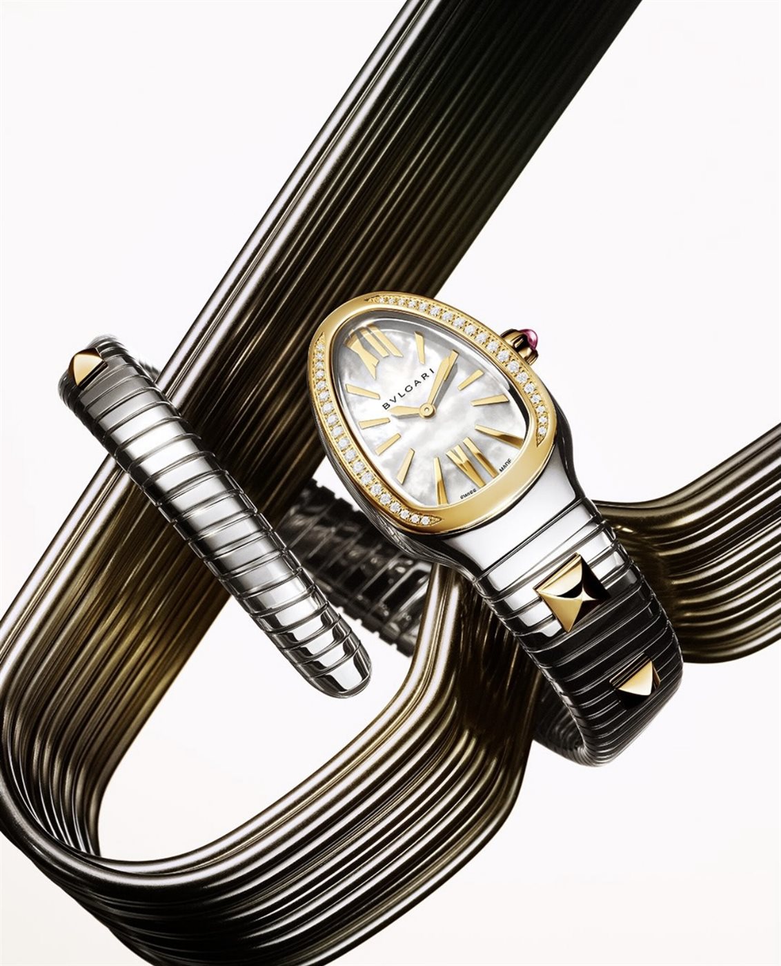 وتُعد هذه القطع امتدادًا لإرث Bulgari في الابتكار، حيث لطالما اعتمدت الدار على التجريب في الخامات والتصاميم لتقديم رؤى جديدة في عالم المجوهرات والساعات. ويظهر ذلك بوضوح في التفاصيل الدقيقة، مثل الخطوط الهندسية والانسيابية التي تميز التصميم، إضافة إلى استخدام عناصر معدنية مرنة تمنح القطعة حركة وحيوية، لتتحول من مجرد إكسسوار إلى عمل فني نابض بالحياة.