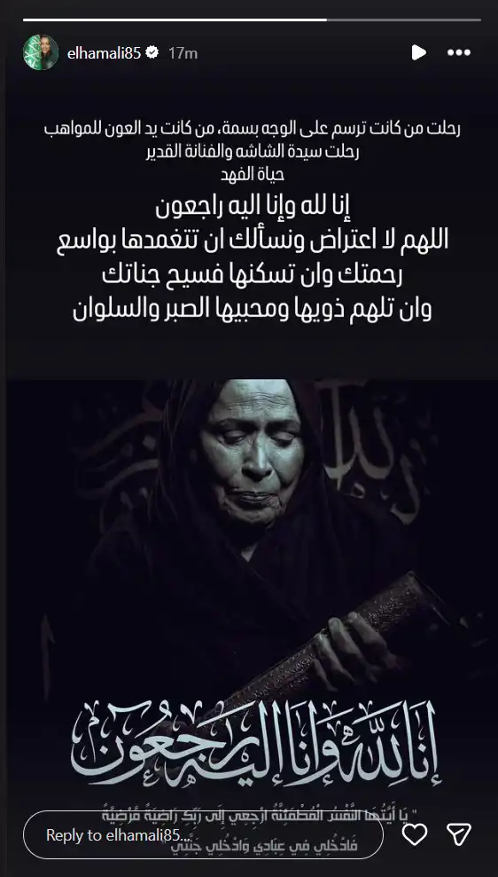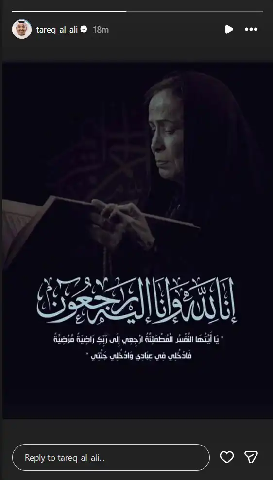 وودعها الفنان طارق العلي بآية قرآنية عبر حسابه:"يا أيتها النفس المطمئنة ارجعي إلى ربك راضية مرضية فادخلي في عبادي وادخلي جنتي".