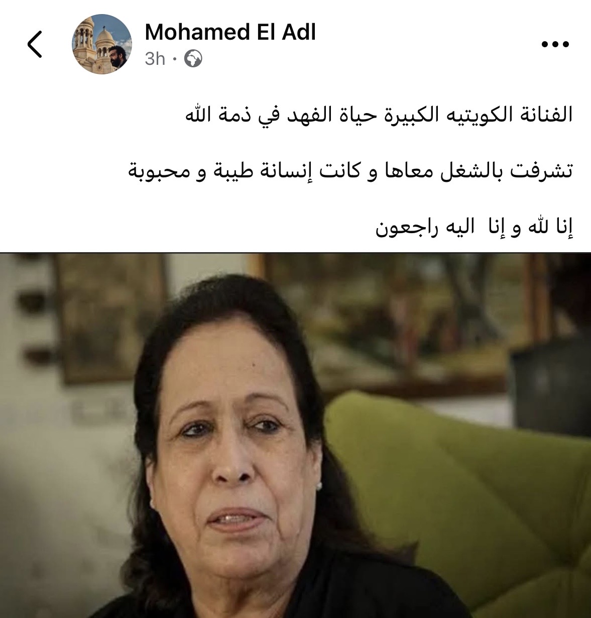 وكتب عبر حسابه على “فيس بوك”: "الفنانة الكويتية الكبيرة حياة الفهد في ذمة الله تشرفت بالشغل معاها وكانت إنسانة طيبة ومحبوبة إنا لله وإنا إليه راجعون".