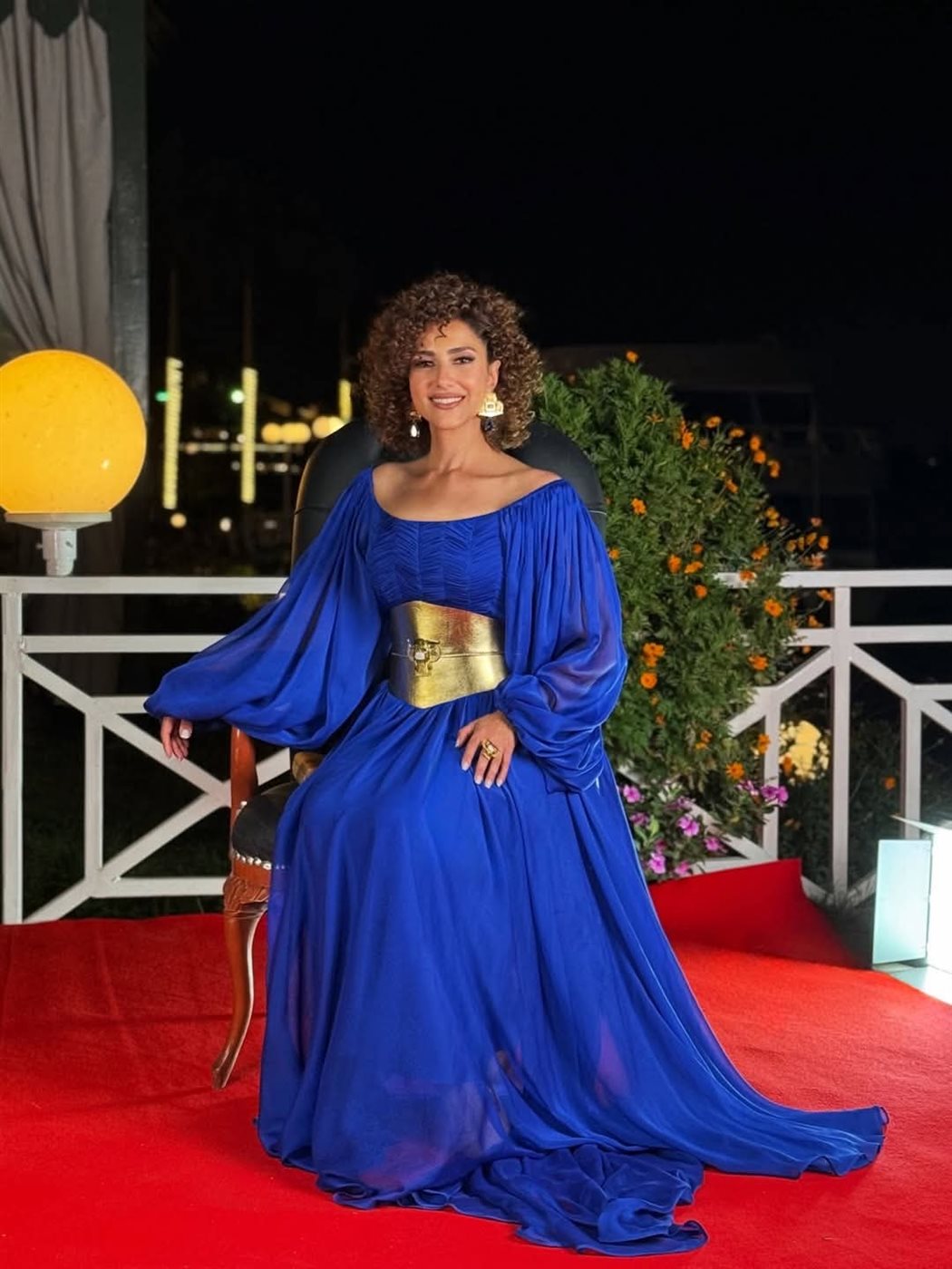 وقد اختارت حنان مطاوع فستانًا طويلًا باللون الأزرق الملكي، تميز بقصة انسيابية ناعمة وأكمام واسعة شفافة أضفت حركة وحيوية على الإطلالة، في تصميم يجمع بين البساطة والفخامة. وجاء الفستان بتوقيع maison.samy، ليعكس رؤية تصميمية تعتمد على إبراز الأنوثة بأسلوب هادئ وأنيق.