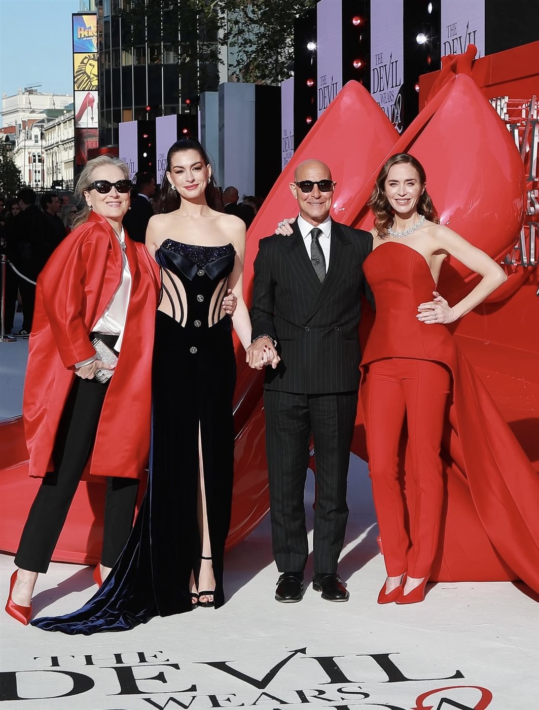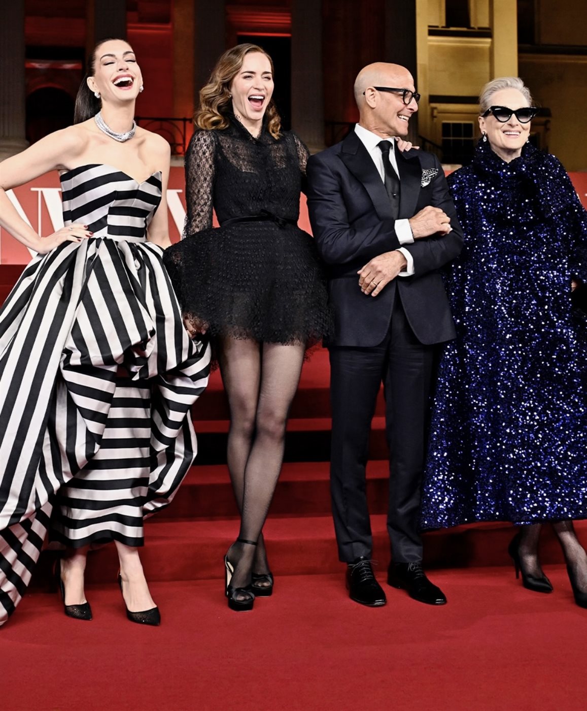 لكن المفاجأة لم تتوقف عند هذا الحد، إذ استبدل النجوم إطلالاتهم لاحقاً خلال حضورهم فعالية “A Night With Runway” التي أقيمت في The National Gallery، ليؤكدوا أن الفيلم لا يتحدث فقط عن الموضة، بل يعيشها بكل تفاصيلها. ظهرت آن هاثاواي بفستان مخطط بالأبيض والأسود بتصميم درامي لافت، بينما اختارت إيميلي بلانت فستاناً أسود قصيراً بتفاصيل شفافة أنيقة. أما ميريل ستريب فلفتت الأنظار بمعطف أزرق لامع يعكس شخصية “ميرندا بريستلي” الأيقونية، في حين حافظ ستانلي توتشي على إطلالته الكلاسيكية الراقية.