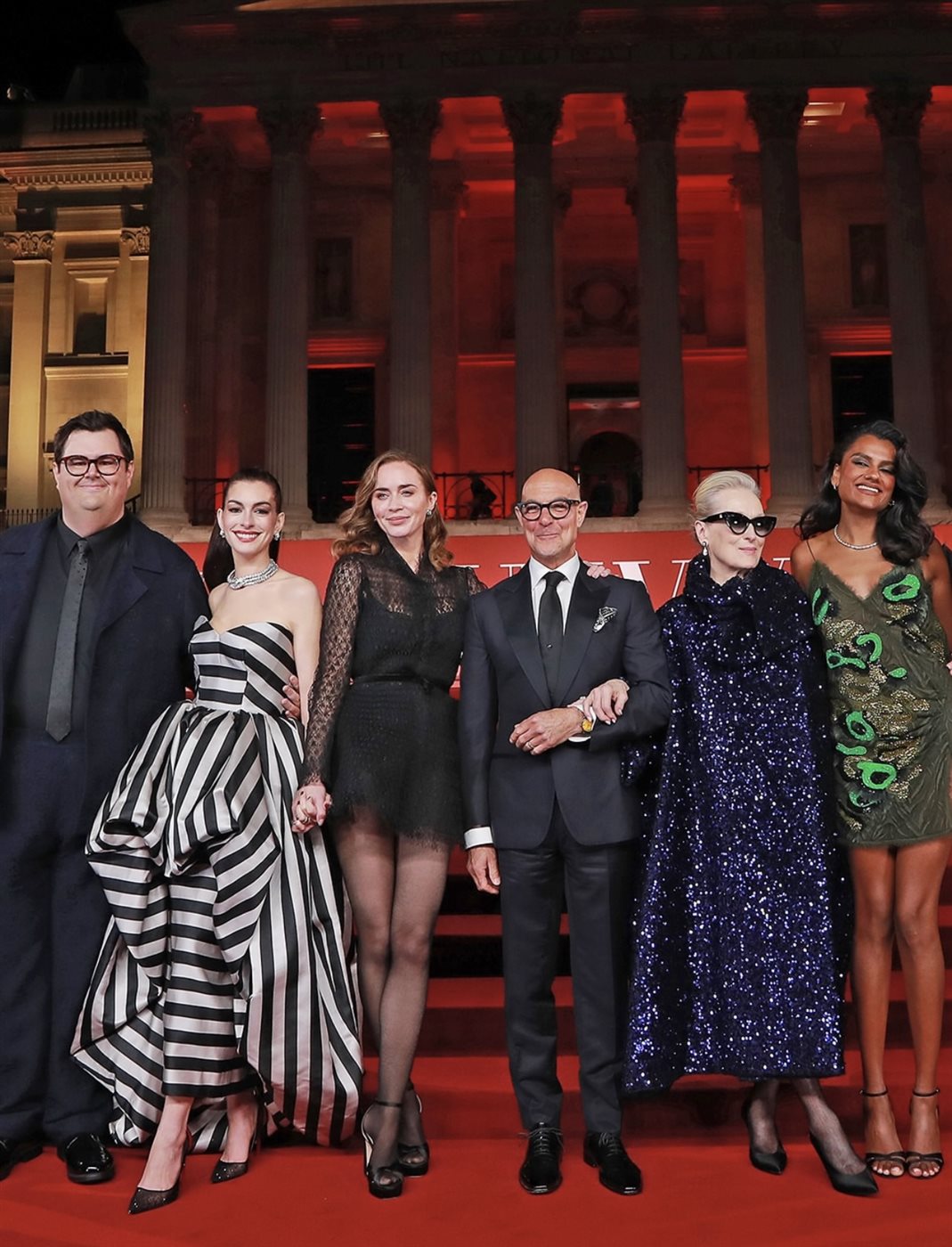 في البداية، خطفت الإطلالات على السجادة الحمراء الأنظار، حيث ظهرت آن هاثاواي بإطلالة حمراء جريئة ذات تصميم نحتي يعكس قوة الشخصية التي تقدمها، بينما اختارت إيميلي بلانت فستاناً أسود أنيقاً بتفاصيل عصرية، أما ميريل ستريب فجسدت أيقونة الأناقة بأسلوبها المعتاد مع لمسة لونية جريئة من خلال معطف أحمر فاخر. وبدوره، حافظ ستانلي توتشي على أناقته الكلاسيكية ببدلة رسمية أنيقة.