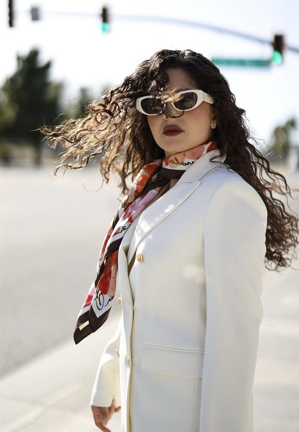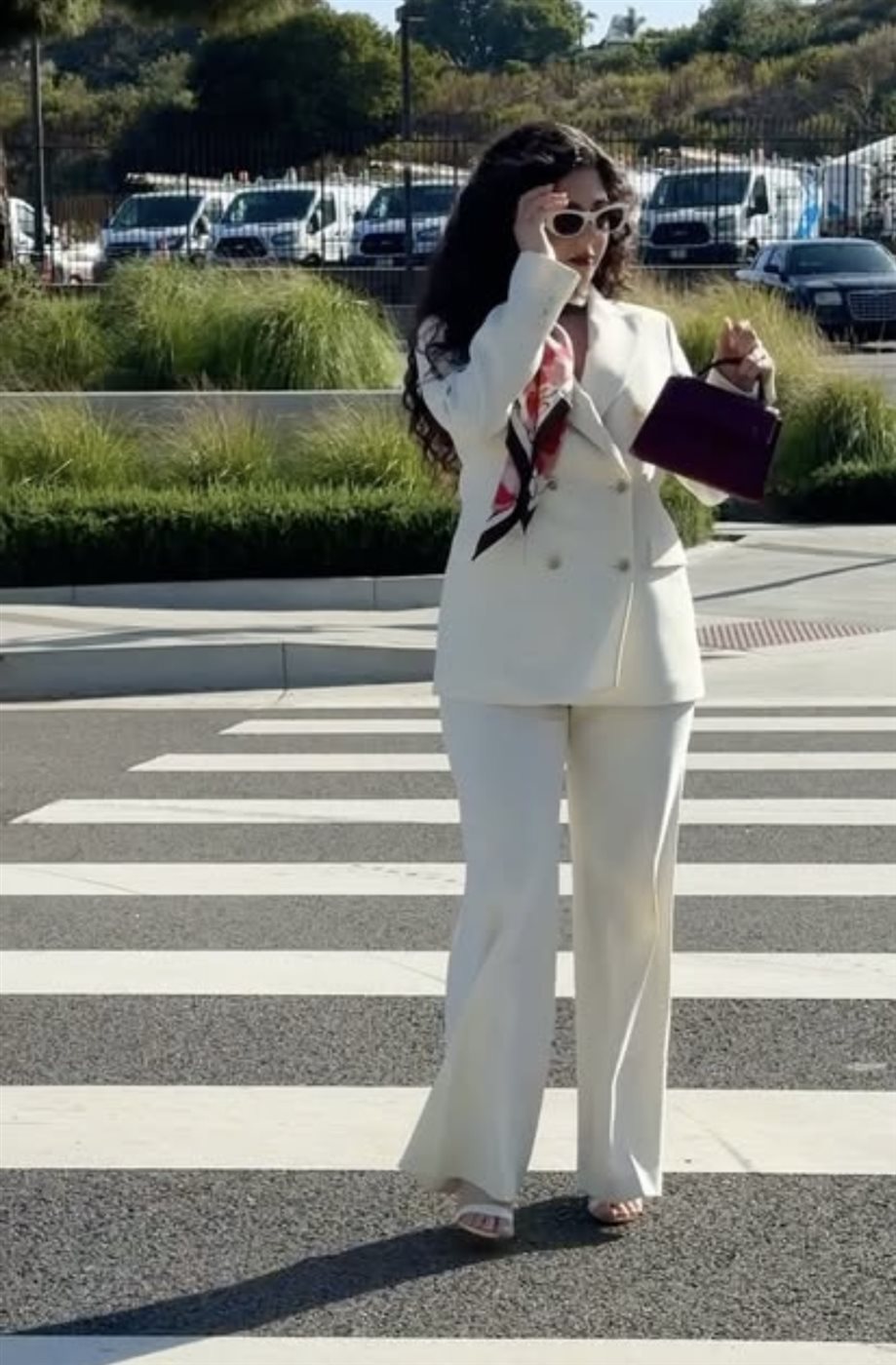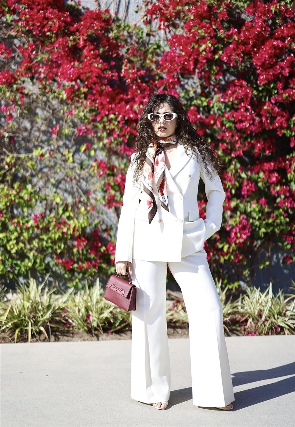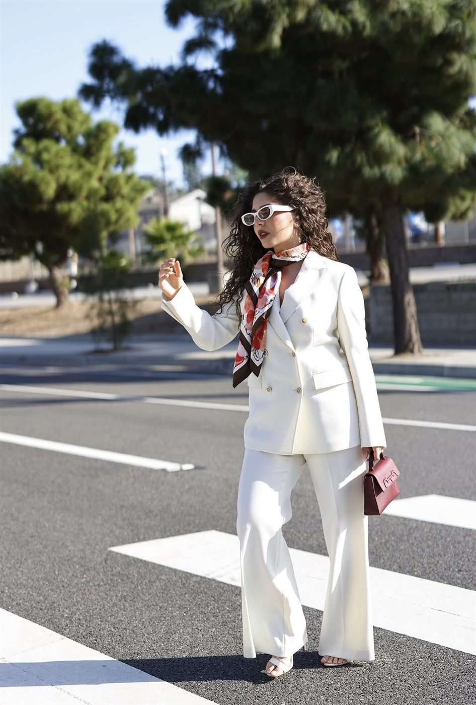 ولم تكتفِ مايان بالبدلة البيضاء، بل أضافت لمسة لونية جذابة من خلال وشاح حريري متعدد الألوان التفّ حول عنقها، ليكسر حيادية الإطلالة ويمنحها روحًا أكثر حيوية. كما اعتمدت نظارة شمسية عصرية بتصميم جريء، عززت من الطابع العصري للإطلالة، وجعلتها أقرب إلى أسلوب “الـ Chic Street Style” الذي يجمع بين العملية والأناقة.