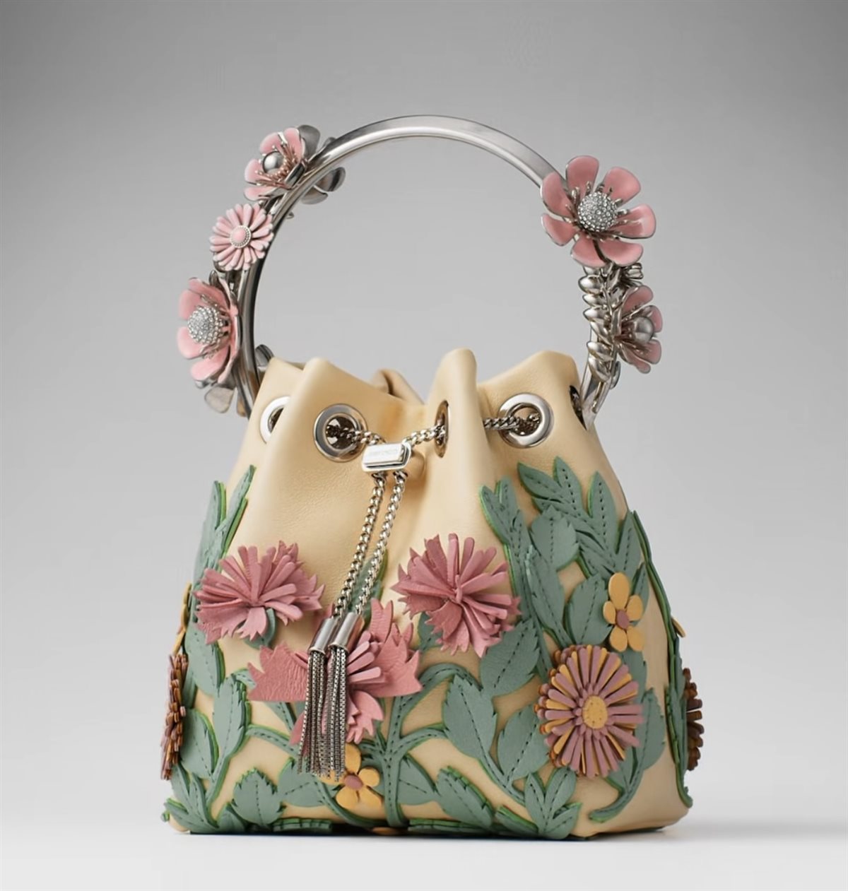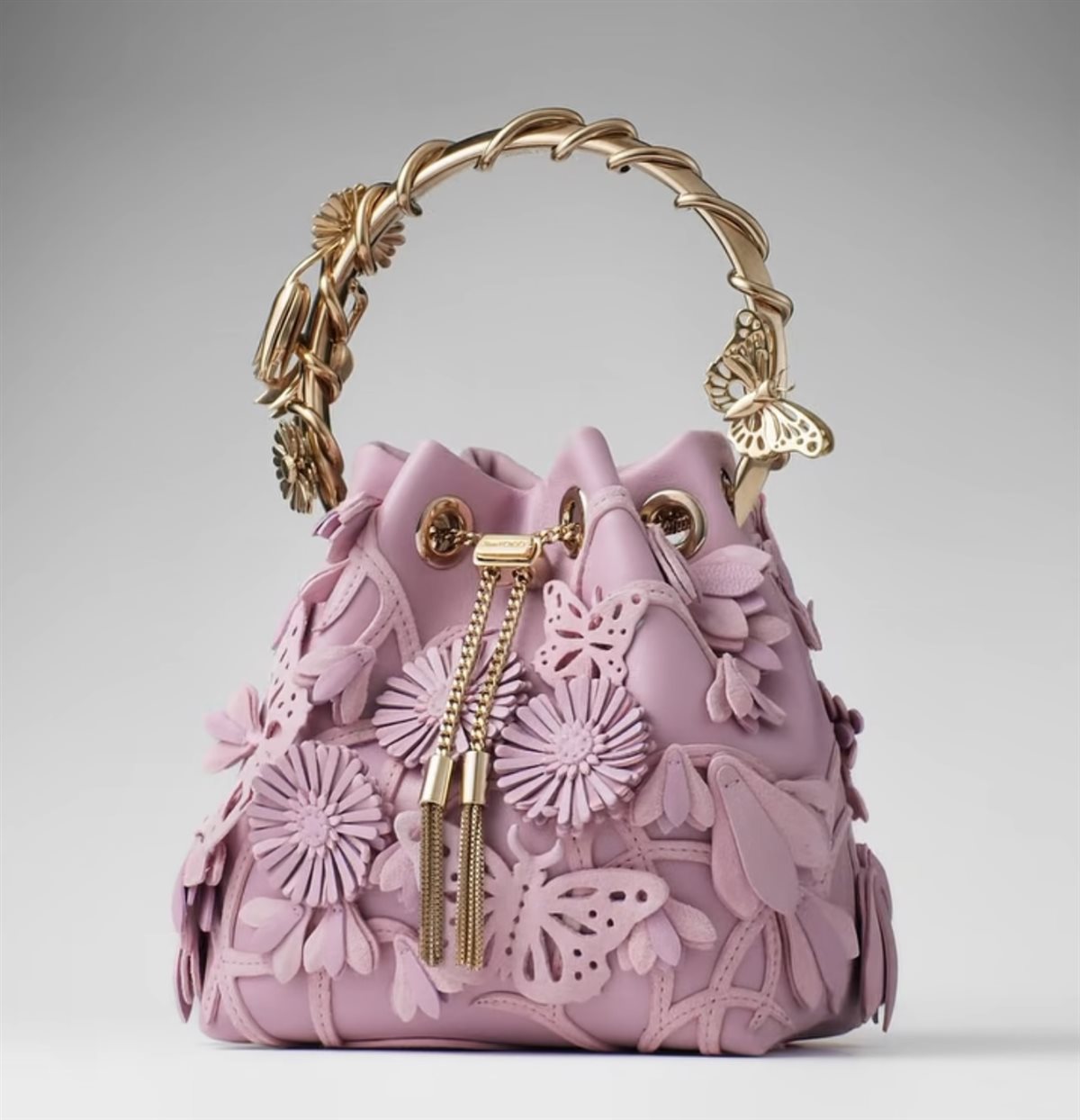وتأتي حقيبة Bon Bon Spring بتصميم استثنائي مصنوع من الجلد باللون الوردي المستوحى من زهرة الفاوانيا، لتجسد روح الربيع بكل ما يحمله من نعومة وانتعاش. وقد تم تزيين الحقيبة بعناصر ثلاثية الأبعاد من الزهور والفراشات، نُفذت بعناية فائقة من خلال خياطة يدوية دقيقة، ما يعكس الحرفية العالية التي تشتهر بها الدار. ولا تقتصر جاذبية التصميم على خامته فقط، بل تمتد إلى المقبض المعدني الذهبي الذي صُمم على شكل سوار مزين بعناصر نباتية، ليضيف لمسة فاخرة توازن بين الرقي والابتكار.