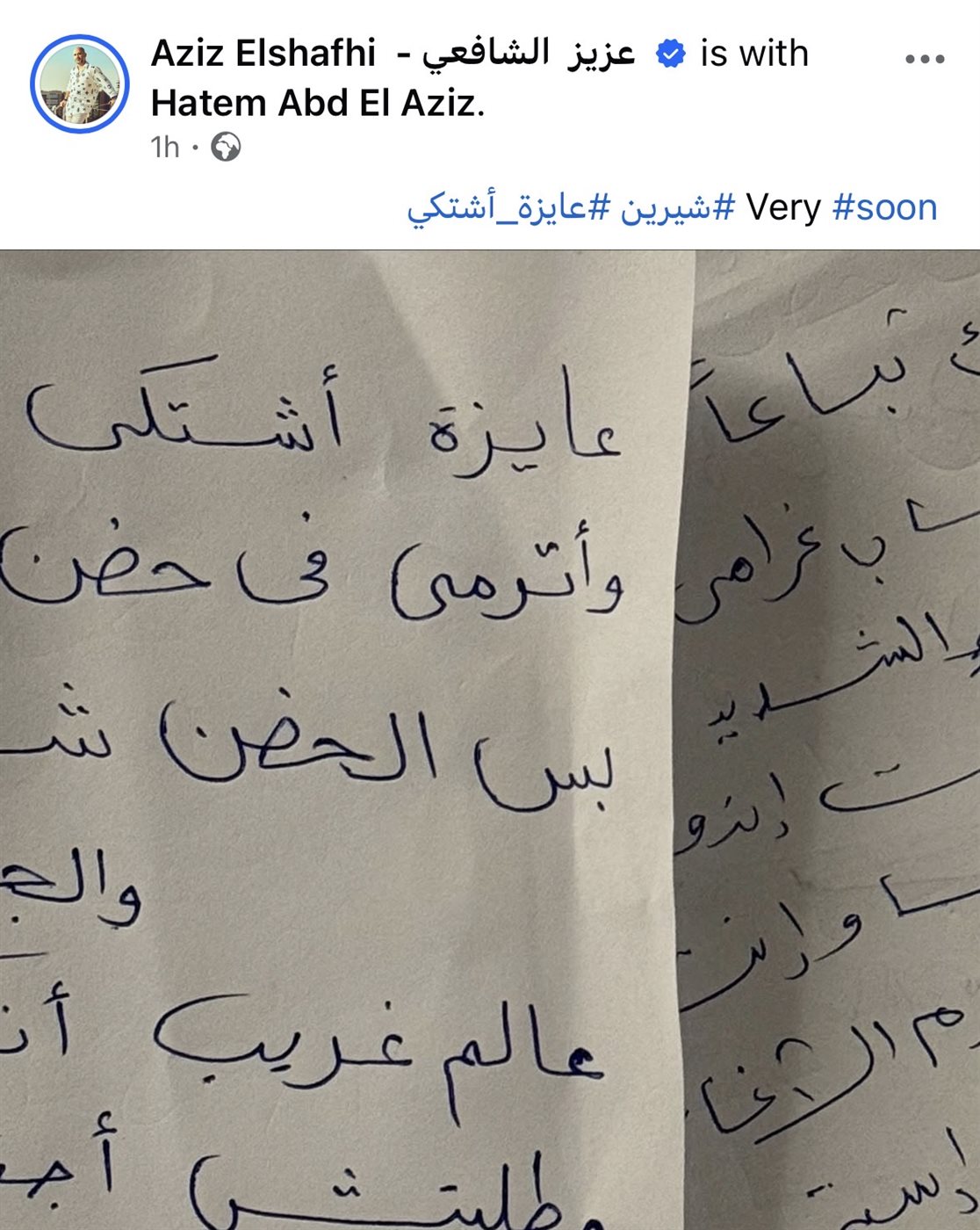 ونشر الشافعي عبر حساباته الرسمية على مواقع التواصل الاجتماعي صورة لورقة تضم مقاطع من كلمات الأغنية مكتفيا بتعليق بسيط "قريبا" ما أثار فضول الجمهور وزاد من حماسهم لمعرفة تفاصيل العمل الجديد خاصة في ظل الشعبية الكبيرة التي تحظى بها شيرين.